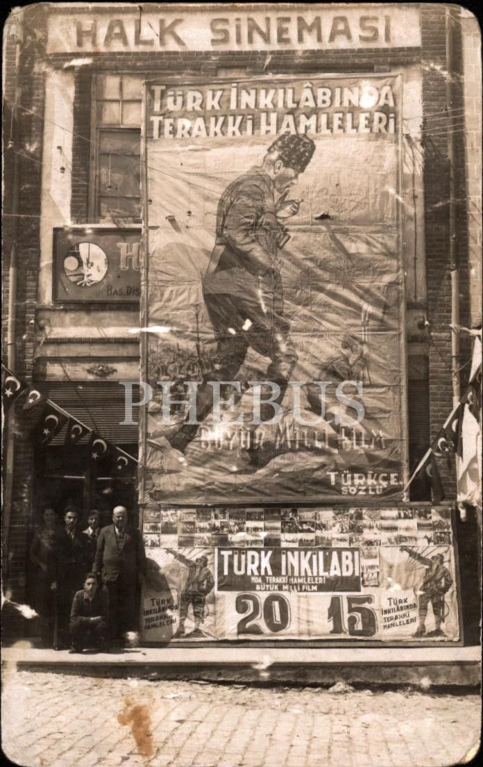 Sinema tarihi: Halk Sineması´nda asılı "Büyük Milli Film: Türk İnkılâbında Terakki Hamleleri" afişinin önünde hatıra fotoğrafı