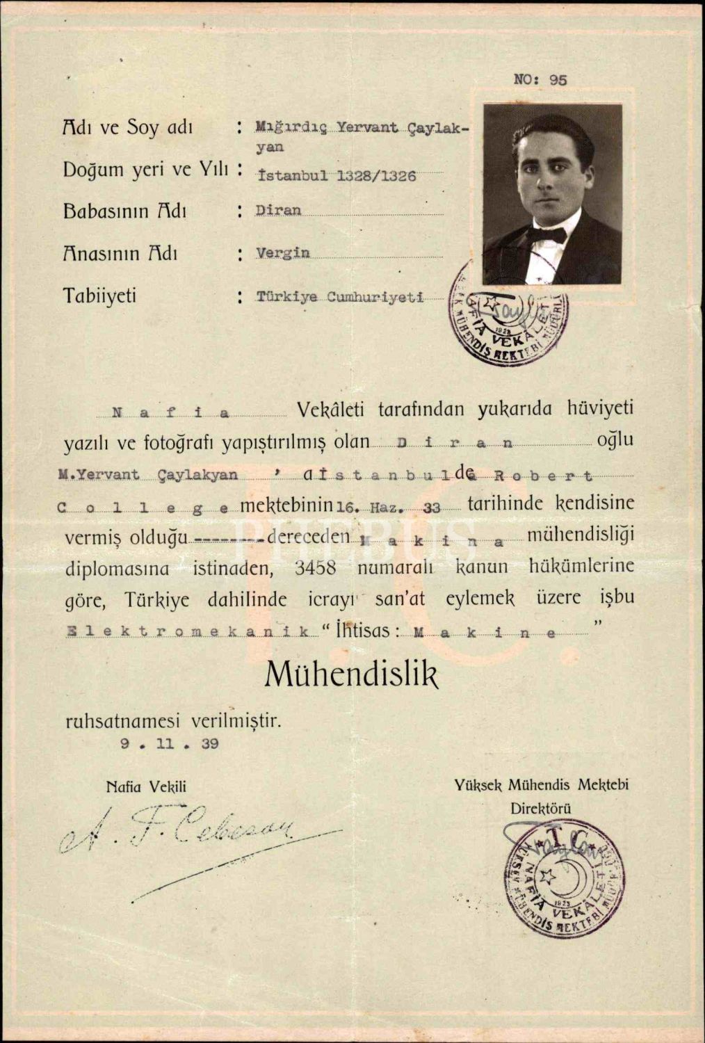 Mığırdıç Yervant Çaylakyan´a verilen fotoğraflı ve Ali Fuat Cebesoy ıslak imzalı mühendislik ruhsatnamesi, 1939 tarihli, 20x30 cm, bir kenarı hafif yırtık haliyle