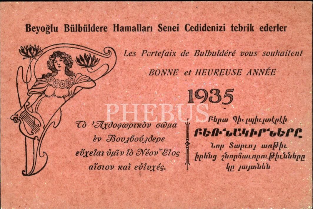 Beyoğlu Bülbüldere Hamalları´nden Türkçe-Fransızca-Rumca-Ermenice yeni yıl tebrik kartı, 9x13 cm
