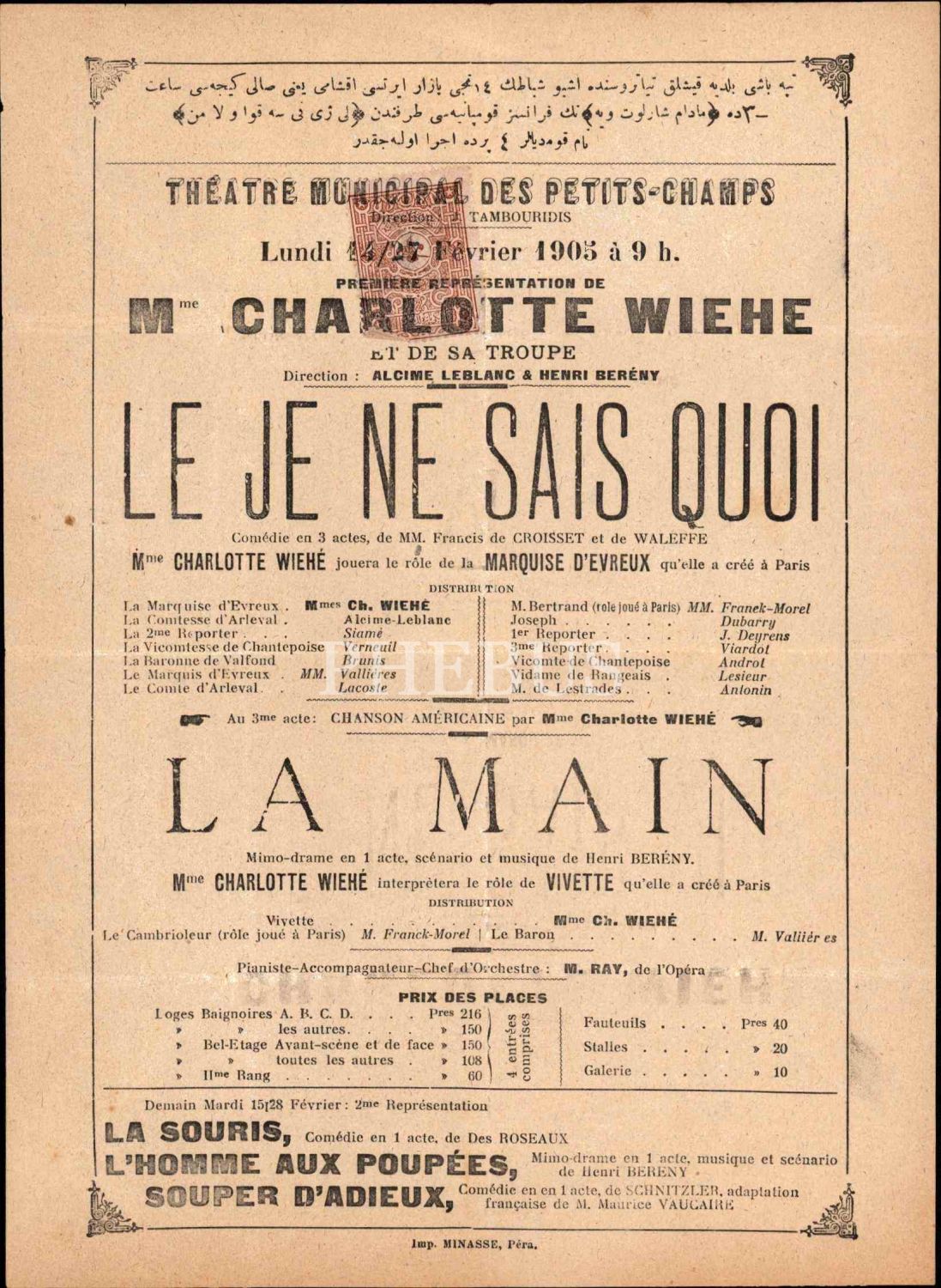 Tiyatro tarihi: Tepebaşı Belediye Tiyatrosu´nda oynanacak Le Je Ne Sais Quoi´nin ilanı, Pera/İstanbul 1905, 21x28 cm