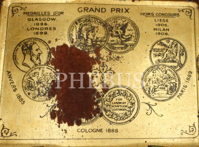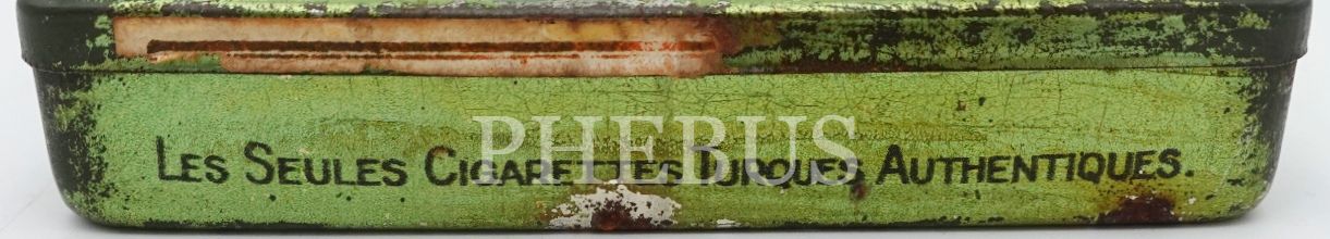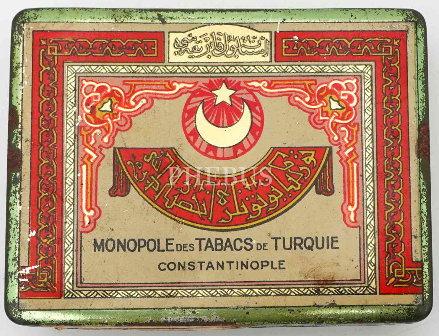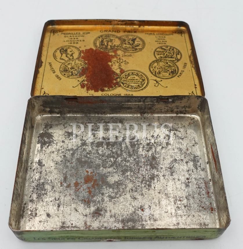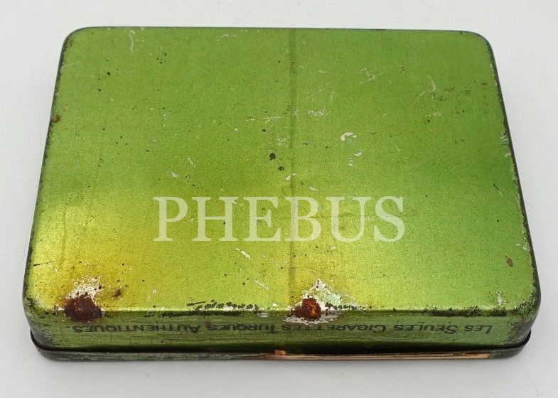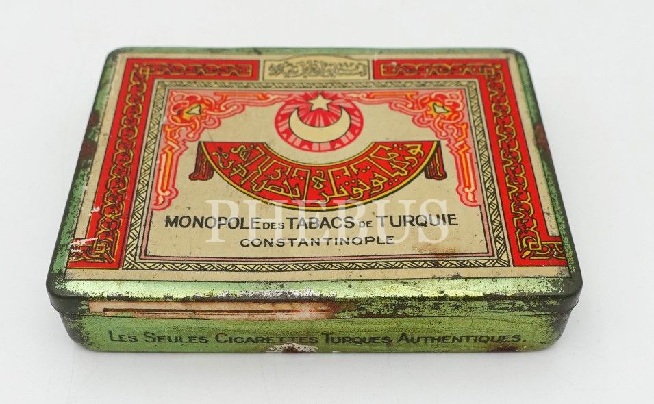 Osmanlıca-Fransızca "Türkiye Tütünler İnhisarı İdaresi- Constantinople" yazılı boş teneke kutu, 2x7x9 cm