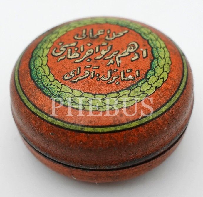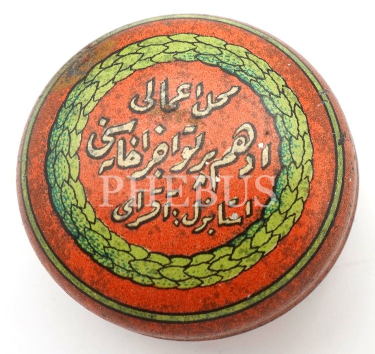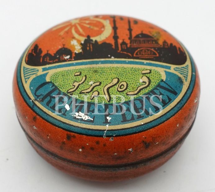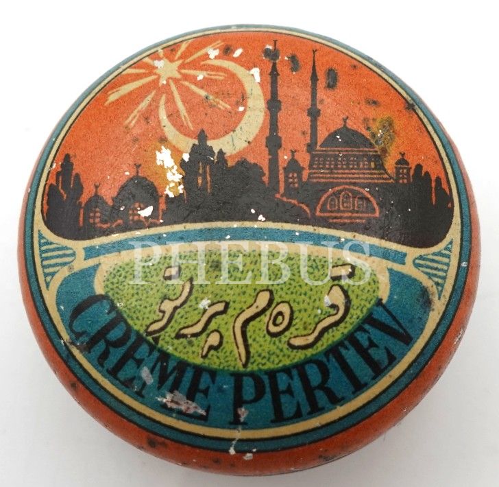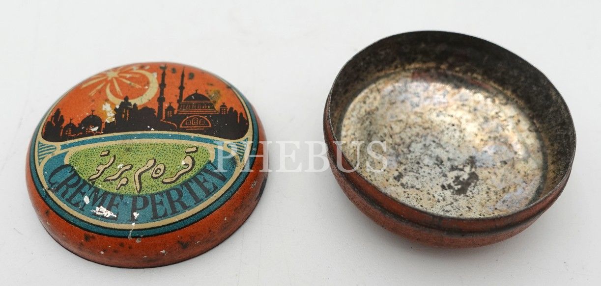 Osmanlı ve Latin harfleriyle "Krem Pertev" yazılı boş teneke kutu, Edhem Pertev Eczahanesi, 1x4 cm