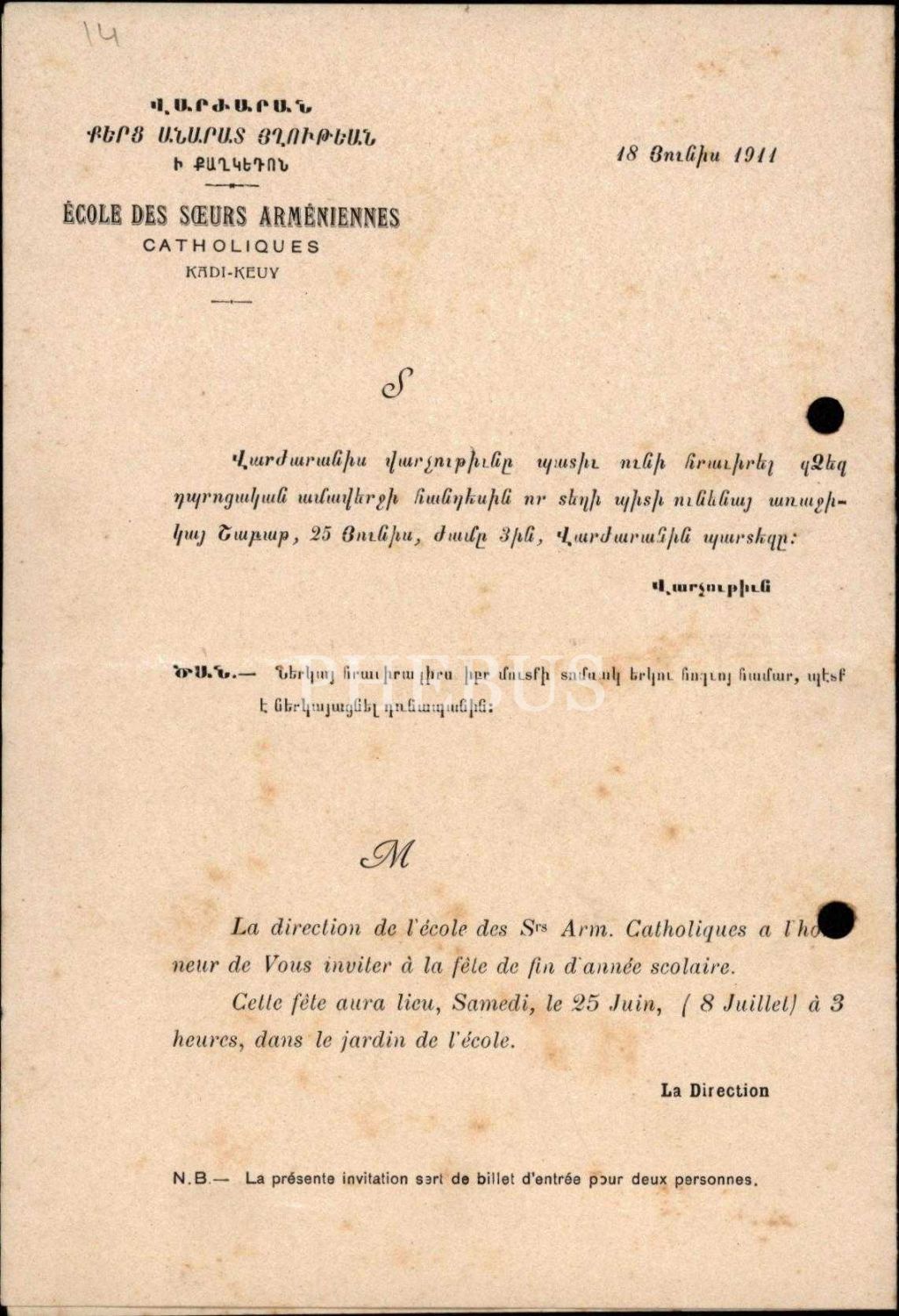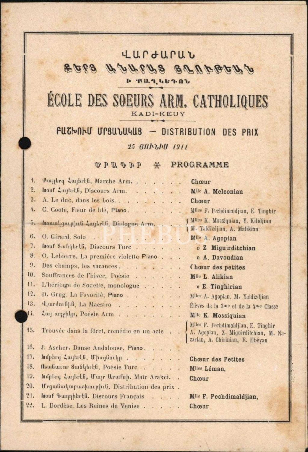 Eğitim tarihi: Katolik okulunda Fransızca-Ermenice ödül dağıtımı programı, Kadıköy/İstanbul 1911, 14x21 cm