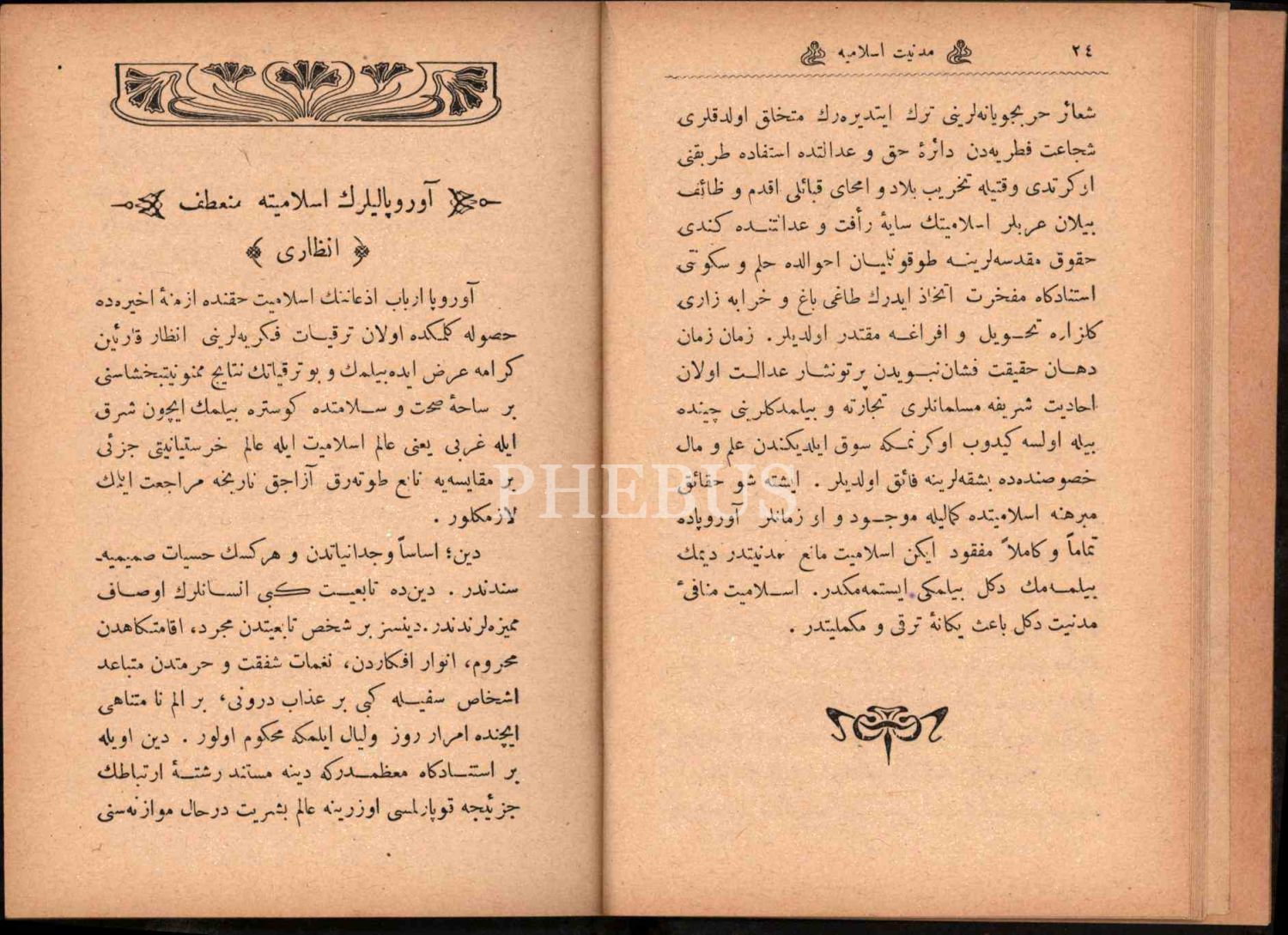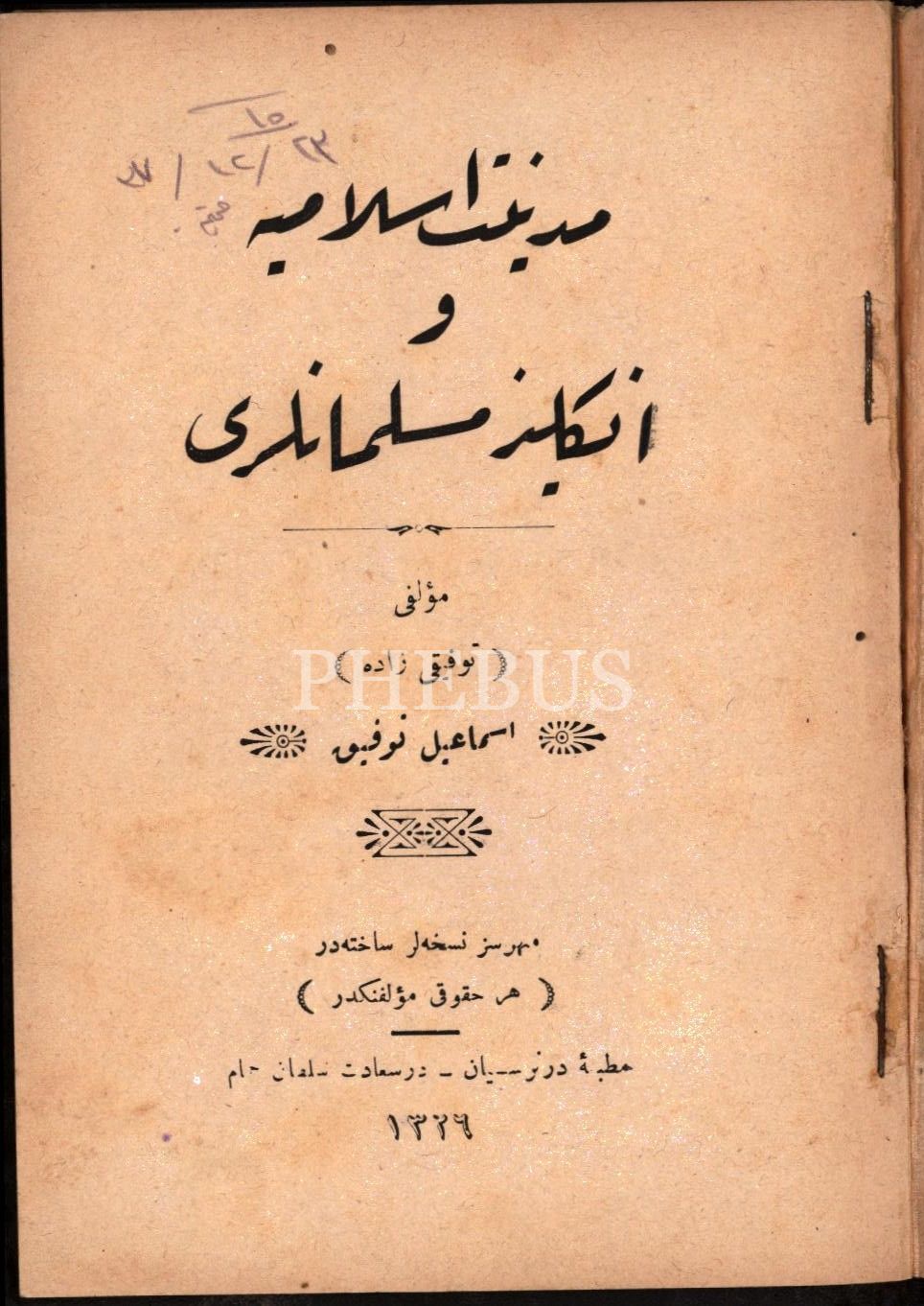 Meşrutiyet sloganları yazılı mükâfat cildinde MEDENİYYET-İ İSLÂMİYYE VE İNGİLİZ MÜSLÜMANLARI, Tevfikzâde İsmail Tevfik, Dernersesyan Matbaası, İstanbul 1326, 96 s., 12x18 cm