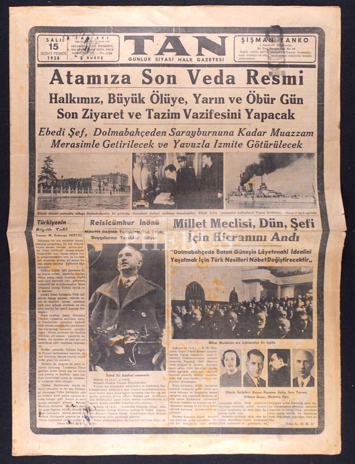 Tan gazetesinin "Atamıza Son Veda Resmi" manşetli 15 İkinciteşrin 1938 tarihli sayısı, 43x59 cm