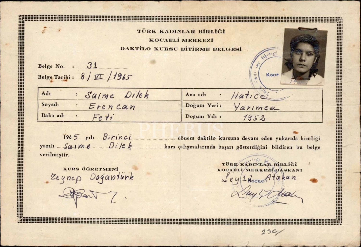 Türk Kadınlar Birliği Daktilo Kursu fotoğraflı sertifikası, Kocaeli 1965, 17x25 cm
