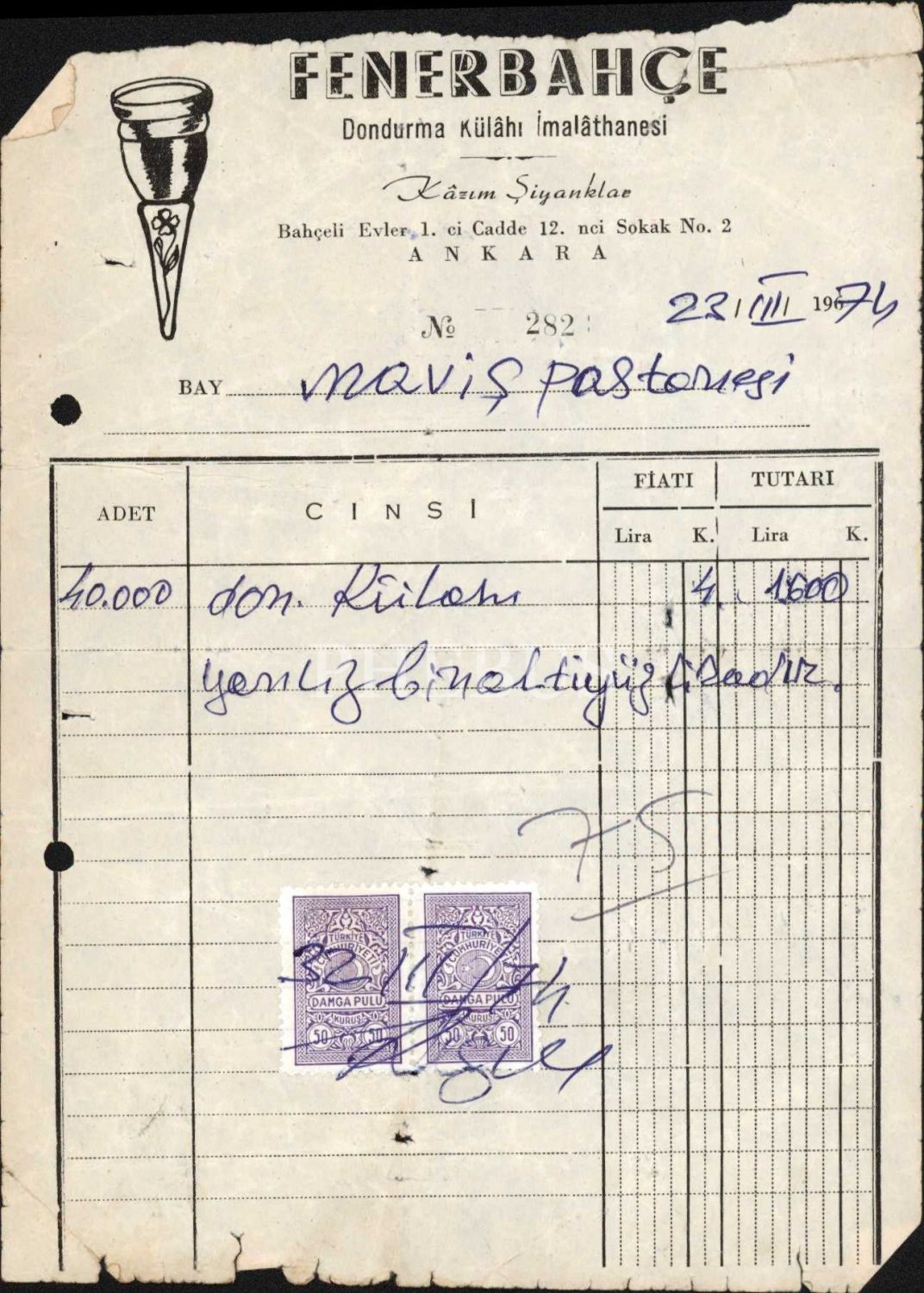 Fenerbahçe Dondurma Külâhı İmalâthanesi antetli fatura, 16x22 cm