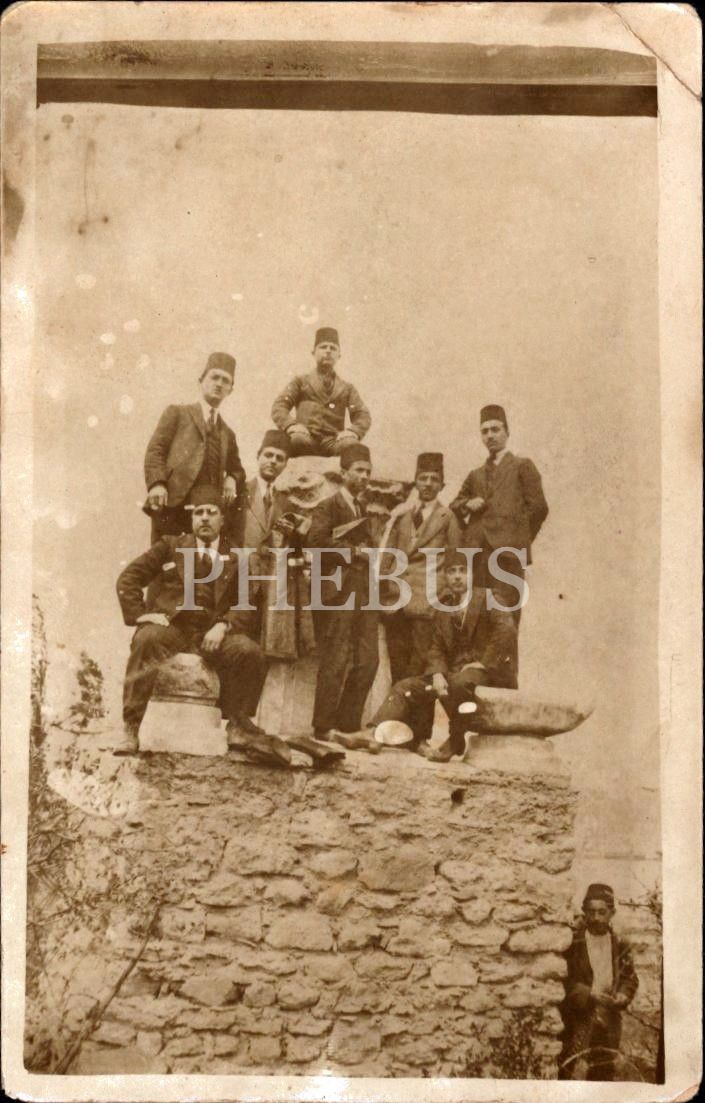 Bir grup fesli beyefendinin hatıra pozu, üst köşesi kırık haliyle