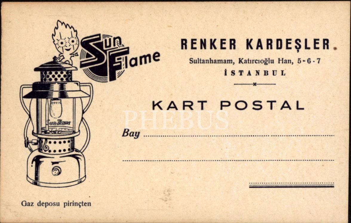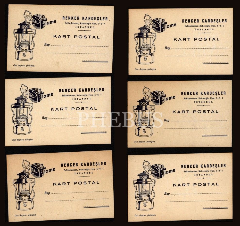 Sun Flame gaz lambası reklamlı 6 adet boş posta kartı, Renker Kardeşler-İstanbul