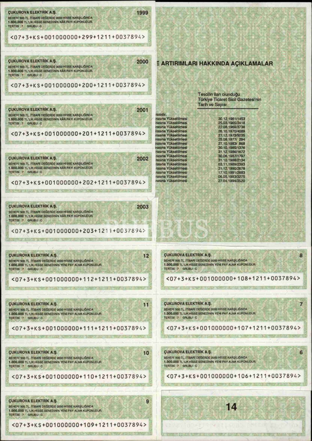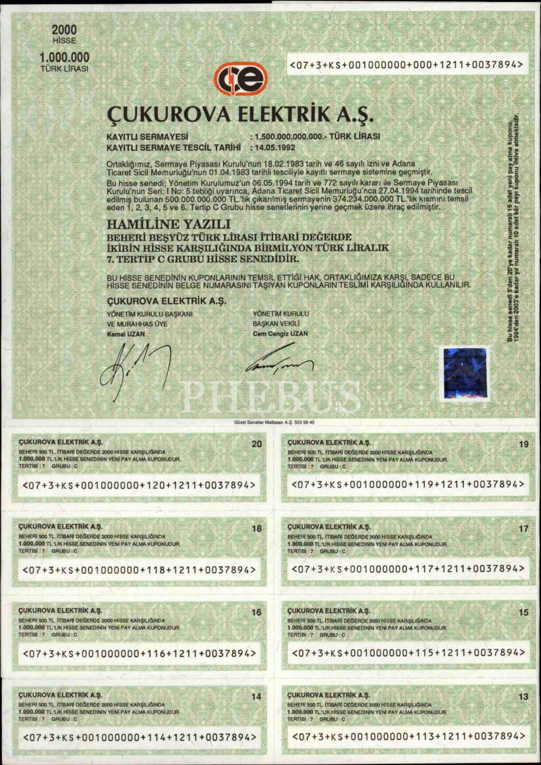 Çukurova Elektrik A.Ş.´ye ait hisse senedi, 29x42 cm