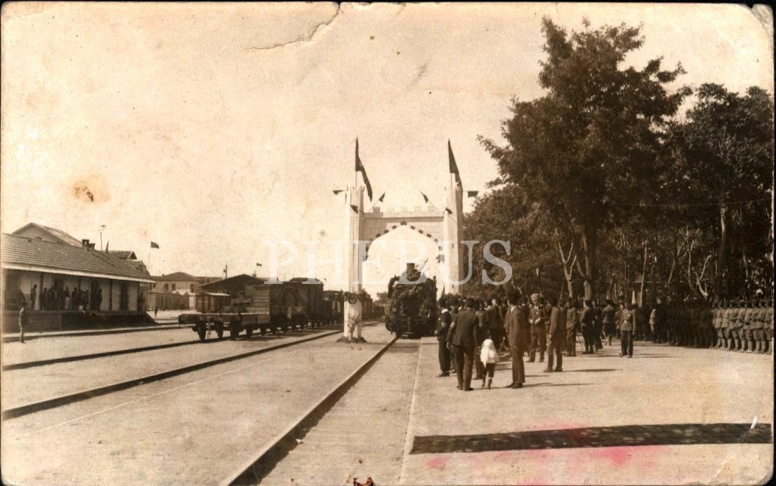 Tak kurulu tren istasyonunda karşılama için bekleşen topluluk, üst kenardan yırtık haliyle