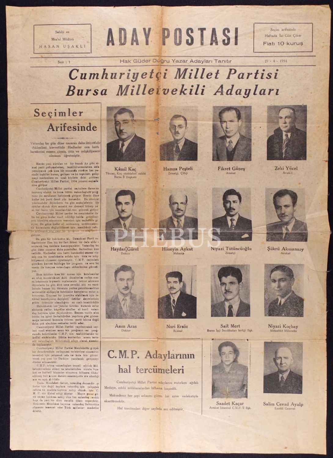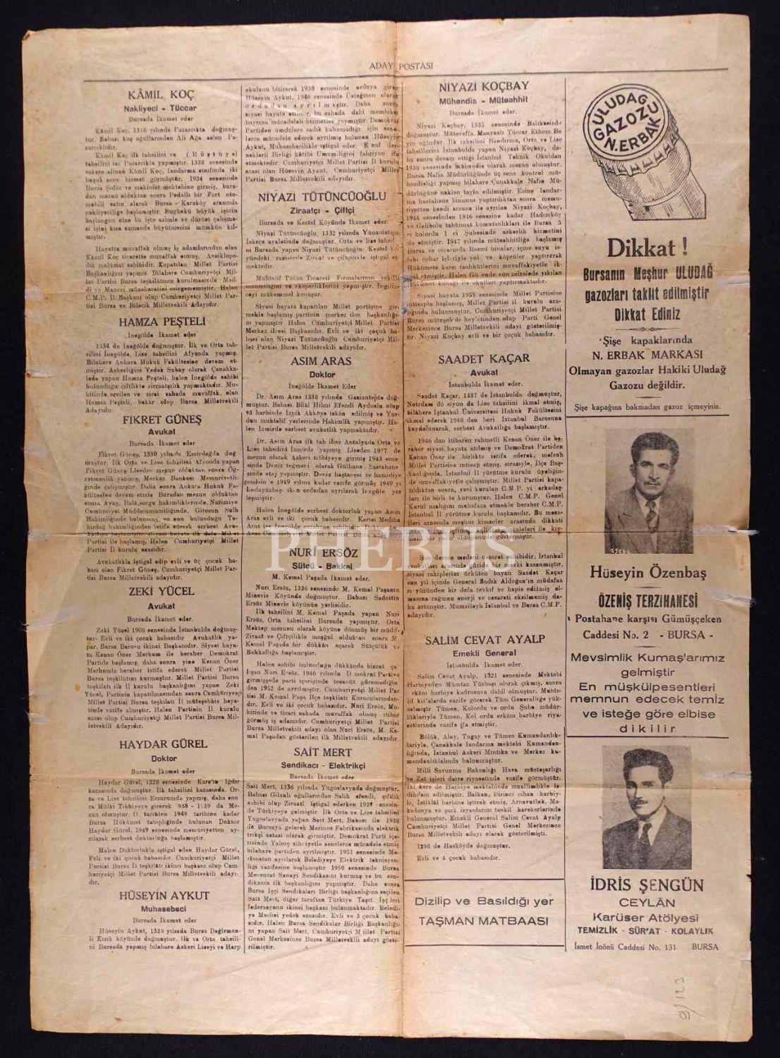 Aday Postası gazetesinin CMP Bursa milletvekili adaylarını gösteren 27 Nisan 1954 tarihli sayısı, 41x57 cm