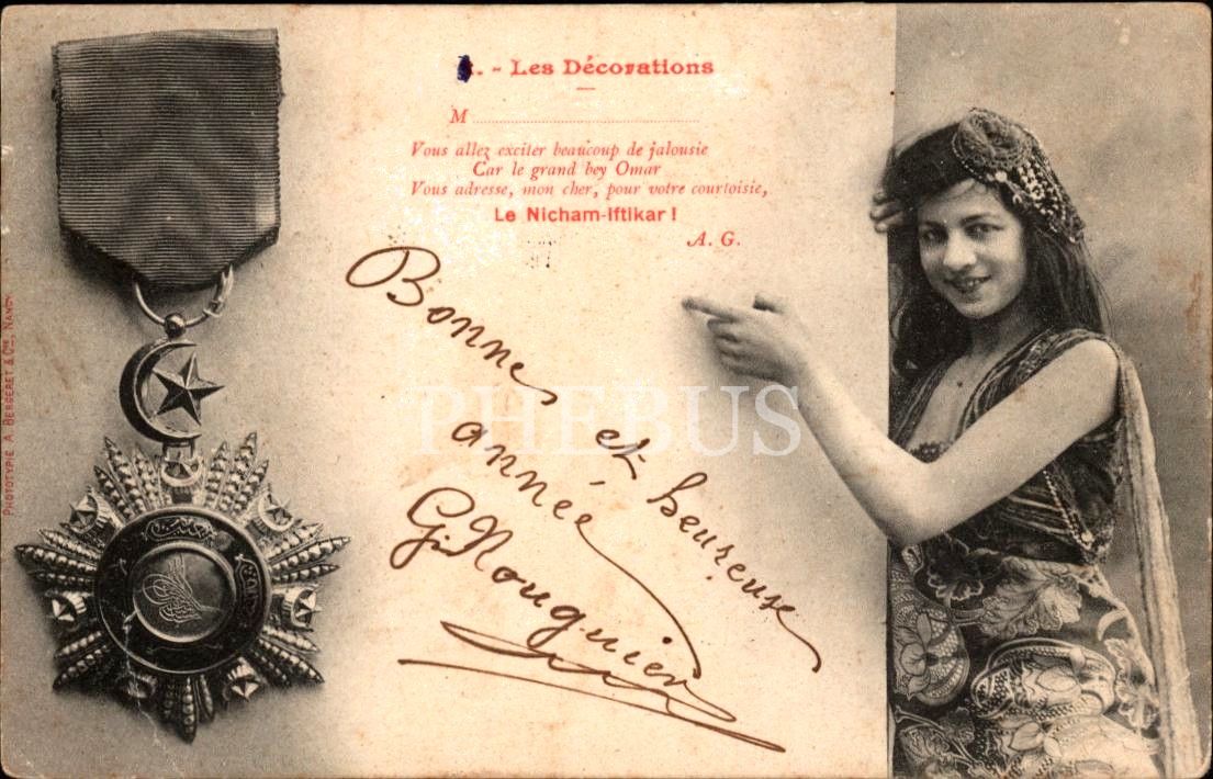 İftihar madalyası ve oryantal güzel, postadan geçmiş kart