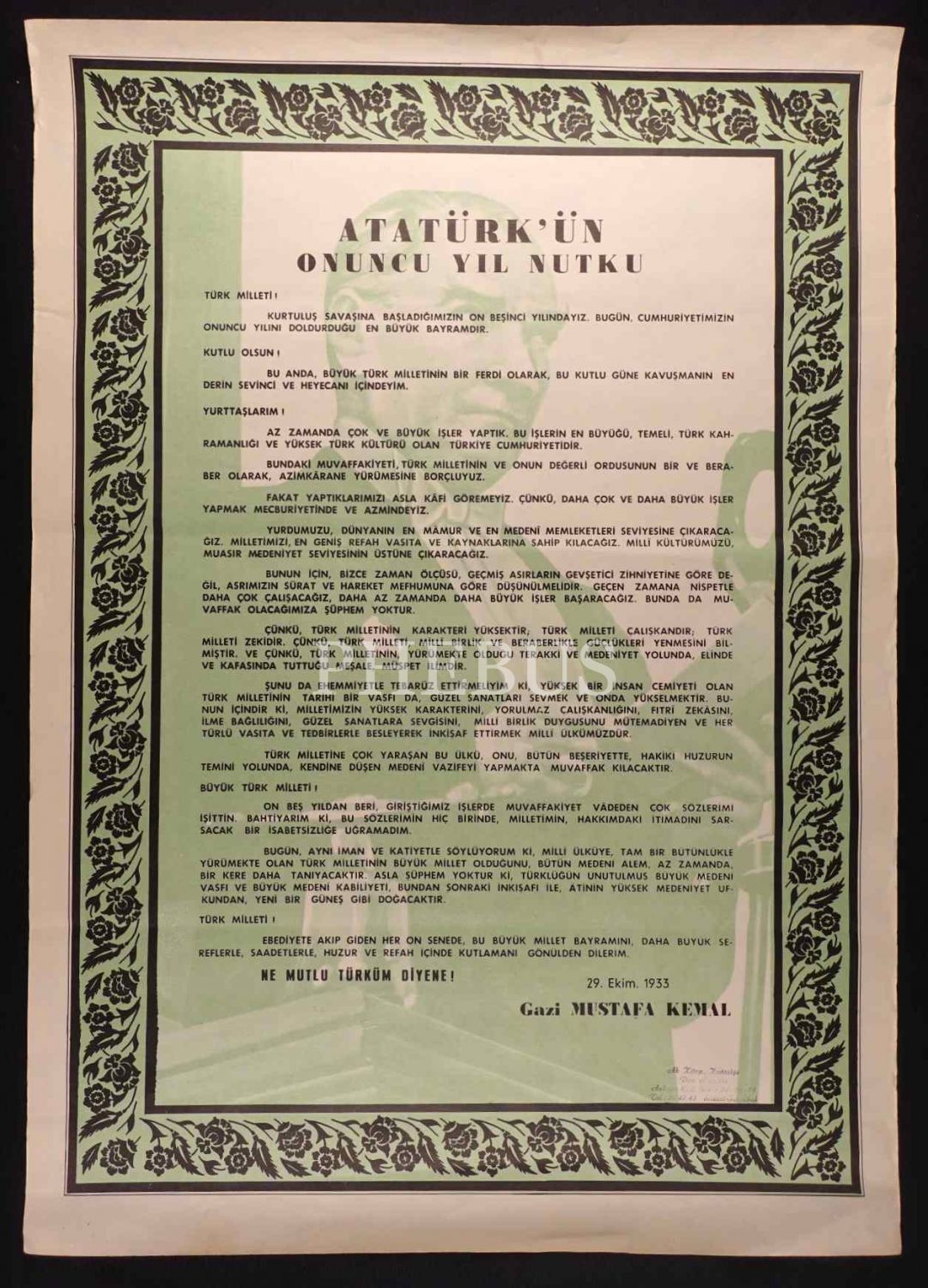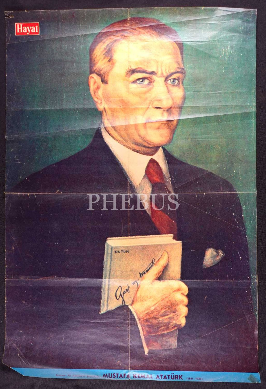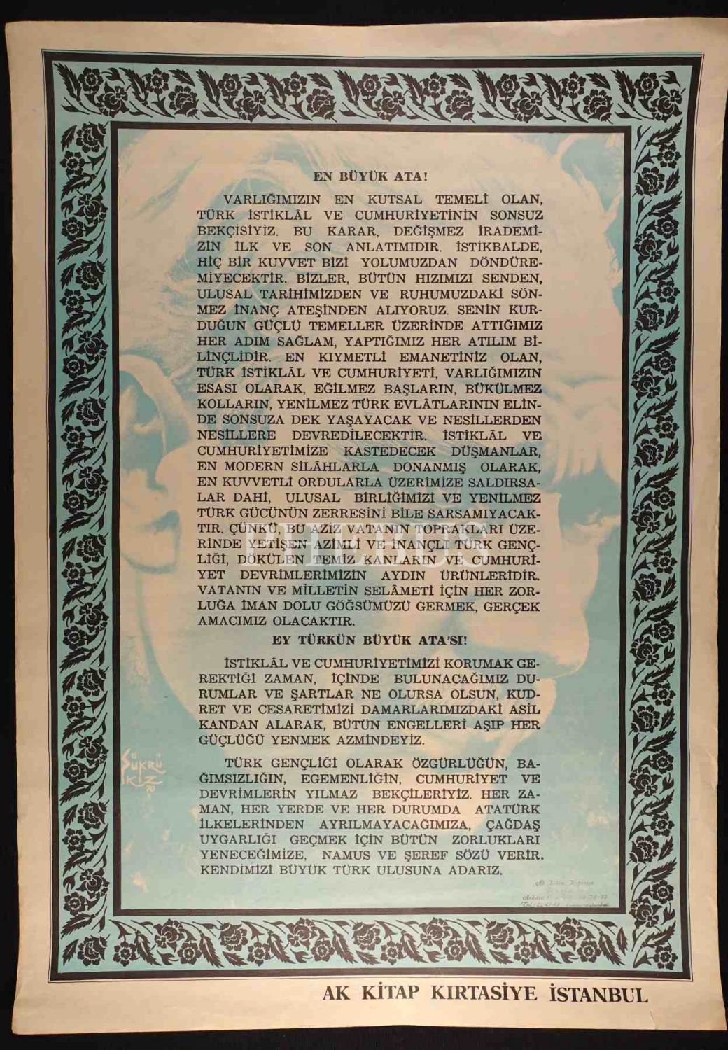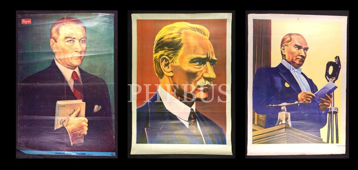 3 adet Atatürk posteri, Atatürk´ün 10. Yıl Nutku ve "En Büyük Ata", Ak Kitap Kırtasiye-İstanbul damgalı, ortalama: 48x67 cm