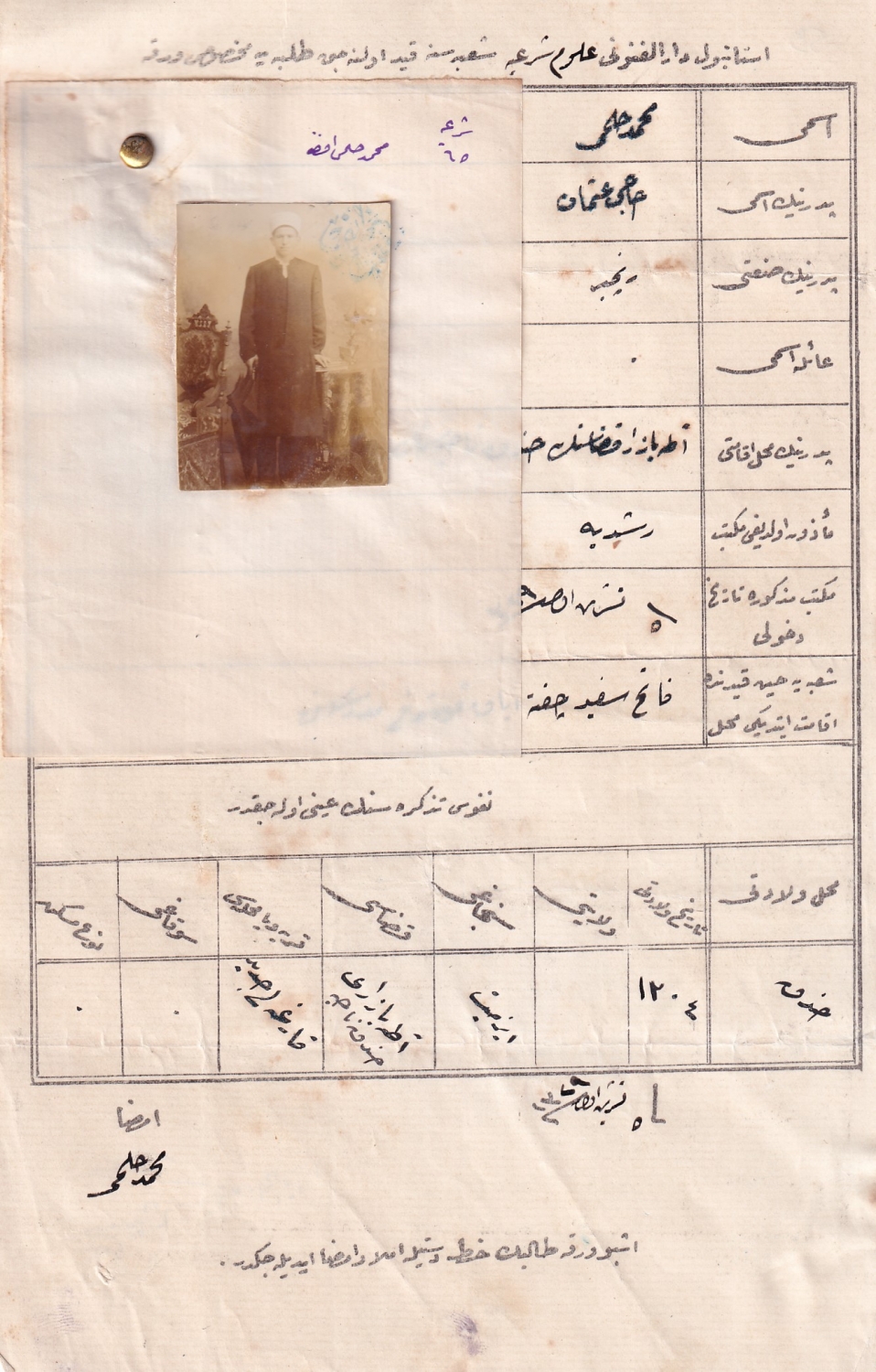 Osmanlı Darülfünun Ulum- i Şeri'yye Fatih şubesine kayıt olunacak Adapazarlı Mehmed Hilmi'ye ait öğrenci belgesi, 1329 tarihli, fotoğraflı, 16x26 cm