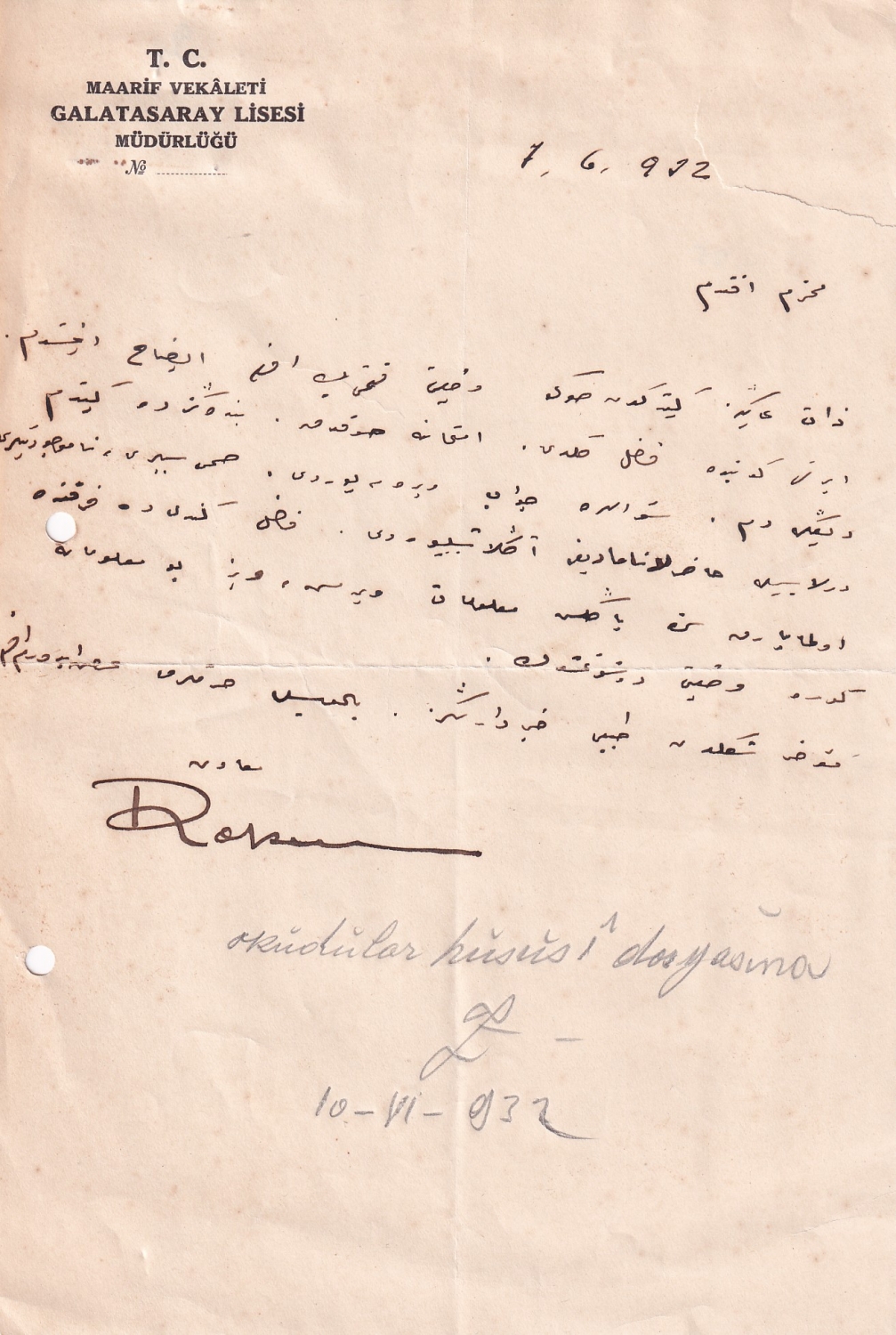 T. C. Maarif Vekaleti Galatasaray Lisesi Müdürlüğü antetli doküman, 1932 tarihli, 16x24 cm