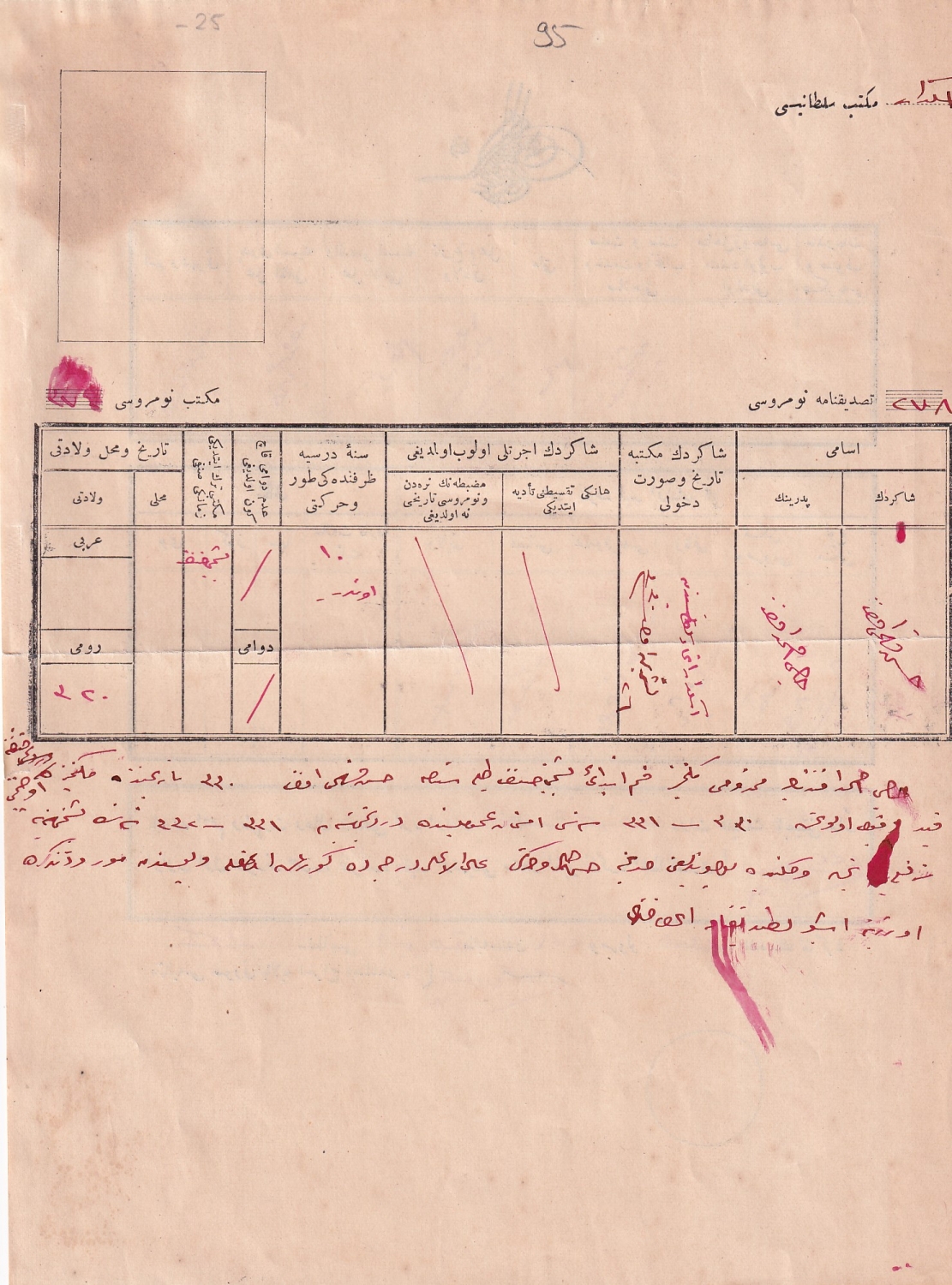 Osmanlı tuğralı Üsküdar Mektebi Sultanisi nüfus tezkeresi, okul belgesi, 1323 tarihli, 18x25 cm