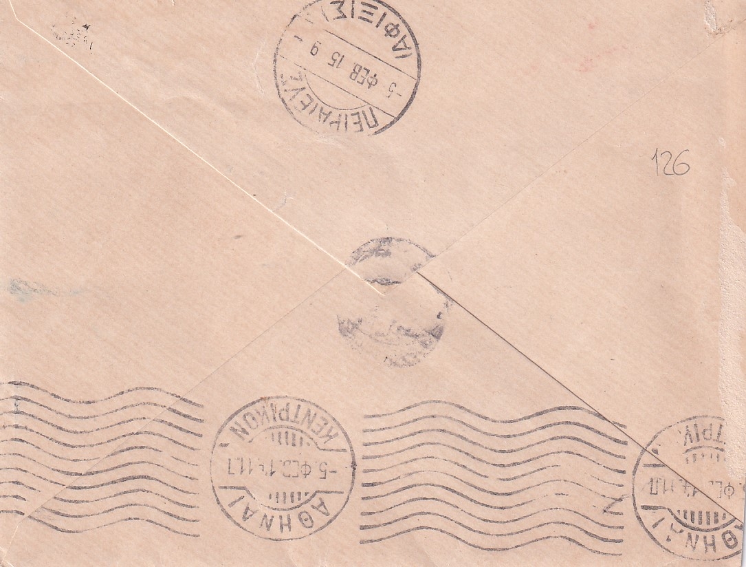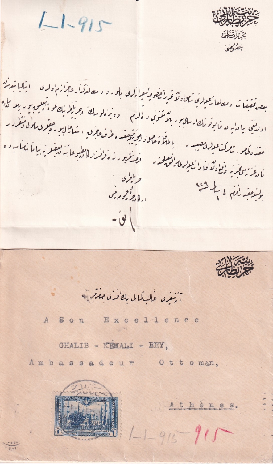 Galip Kemali Bey'e yazılmış, Harbiye Nezareti antetli ve Harbiye Nazırı Enver Paşa ıslak imzalı dokuman, 1915 tarihli pullu, damgalı postadan geçmiş zarf, Atina adresli, 13x22 cm
