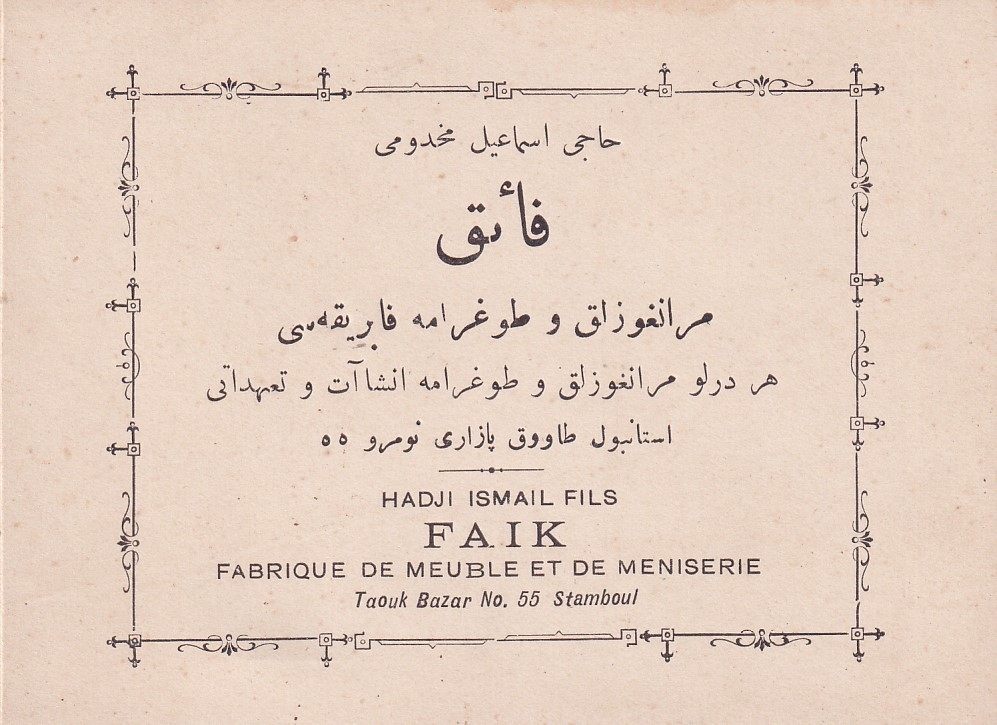 Osmanlıca - Fransızca Hacı İsmail Mahdumu Faik Marangozluk ve Doğrama Fabrikası iş yeri kartı, 13x9 cm
