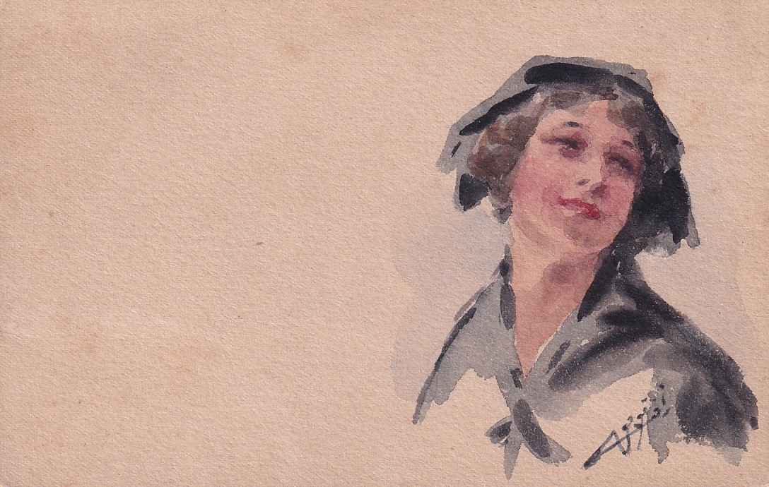 Osmanlı dönemi meşhur ressam RAFET BAŞOKÇU suluboya çizim kadın tip kartpostal