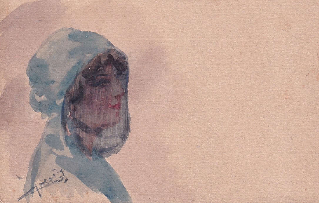 Osmanlı dönemi meşhur ressam RAFET BAŞOKÇU suluboya çizim kadın tip kartpostal