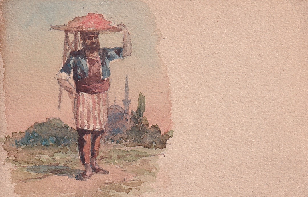 Osmanlı dönemi el yapımı suluboya kartpostal, meslek simitçi