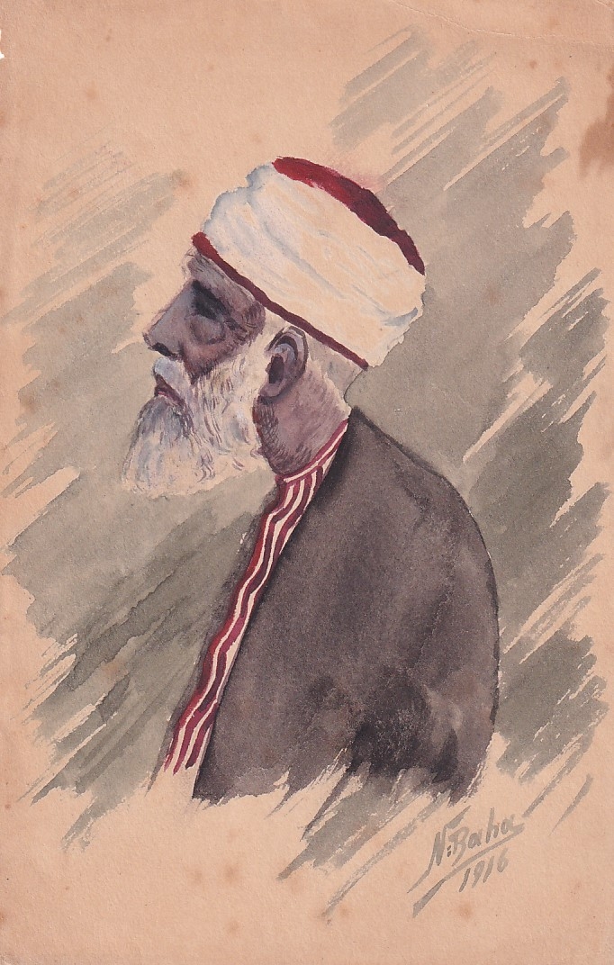 Osmanlı dönemi el yapımı suluboya kartpostal, Derviş tip, 1916 tarihli imzalı