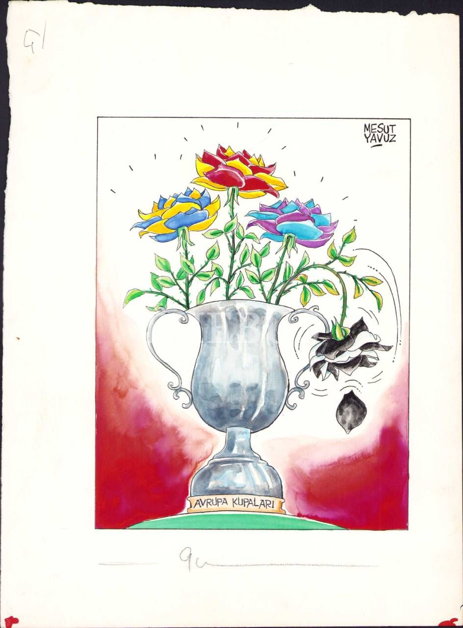 Mesut Yavuz imzalı, "Avrupa Kupaları" yazılı, Fenerbahçe-Galatasaray-Trabzonspor konulu karikatür, 26x35 cm