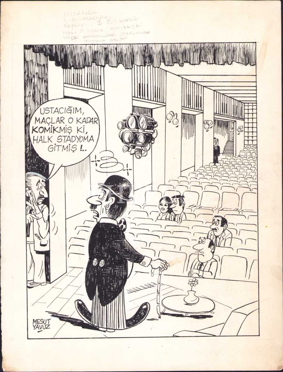 Mesut Yavuz imzalı, maçları tiye alan karikatür, 26x35 cm, ortadan kat izli haliyle
