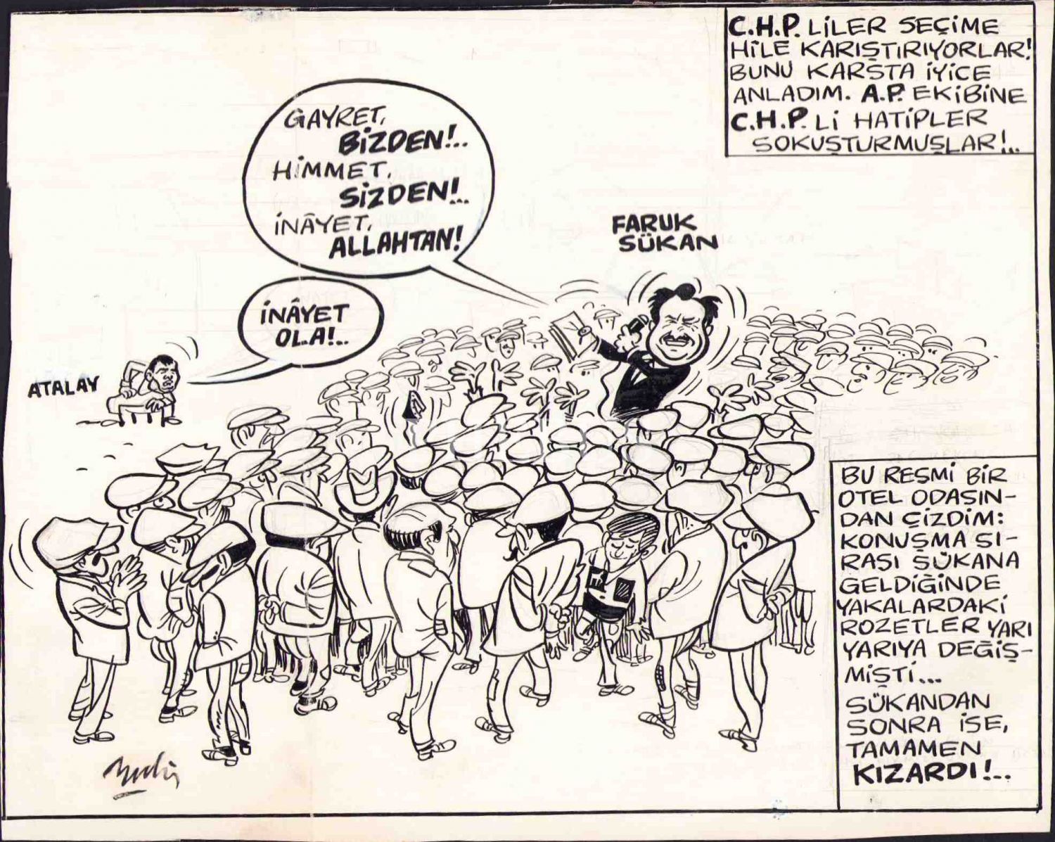 Bedri [Koraman] imzalı, Faruk Sükan ve miting konulu karikatür, 25x20 cm