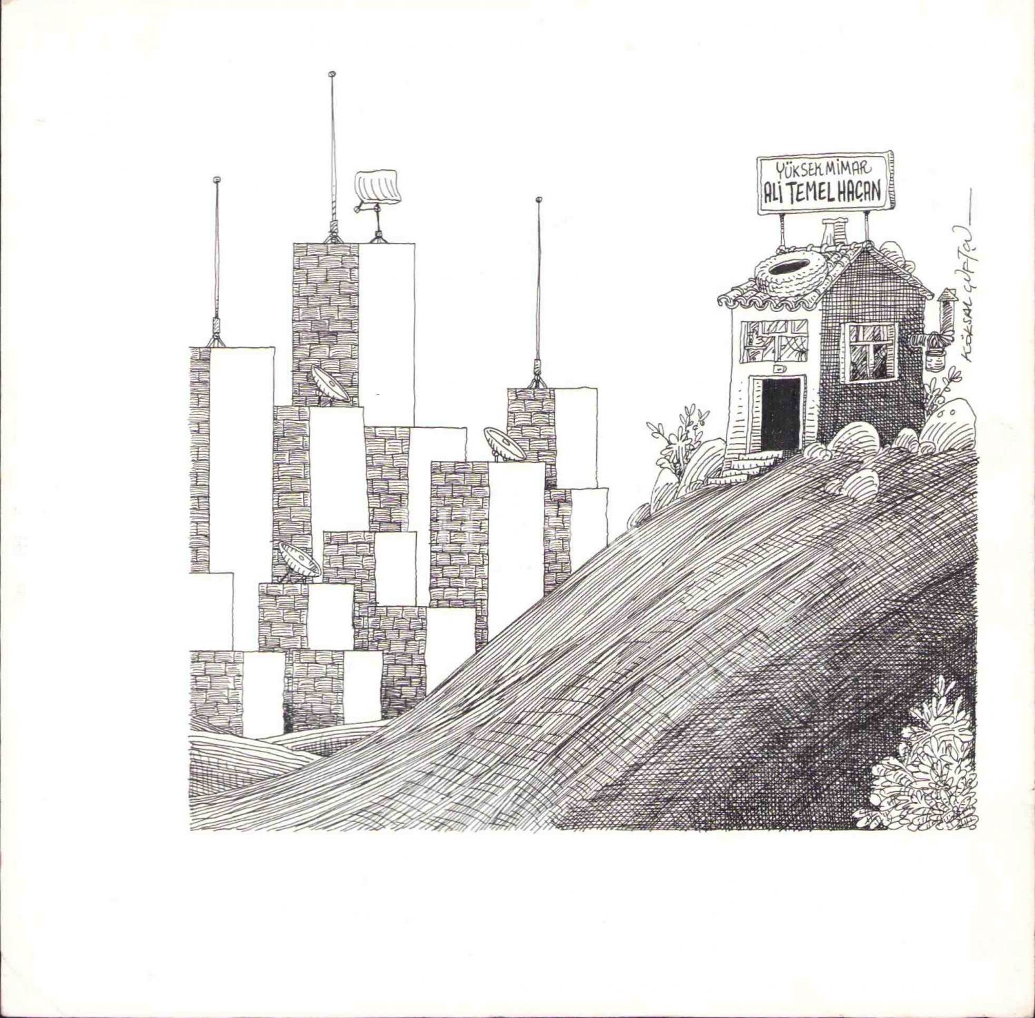 Köksal Çiftçi imzalı, "Yüksek Mimar Ali Temel Haçan" üzerinden şehir planlamasını tiye alan karikatür, 25x25 cm