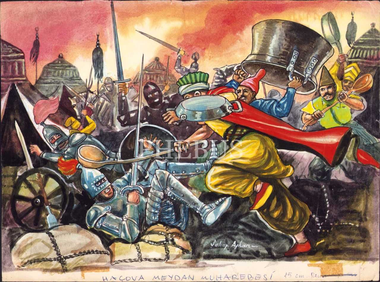 Şahap Ayhan imzalı "Haçova Meydan Muharebesi" çizimi, 33x25 cm