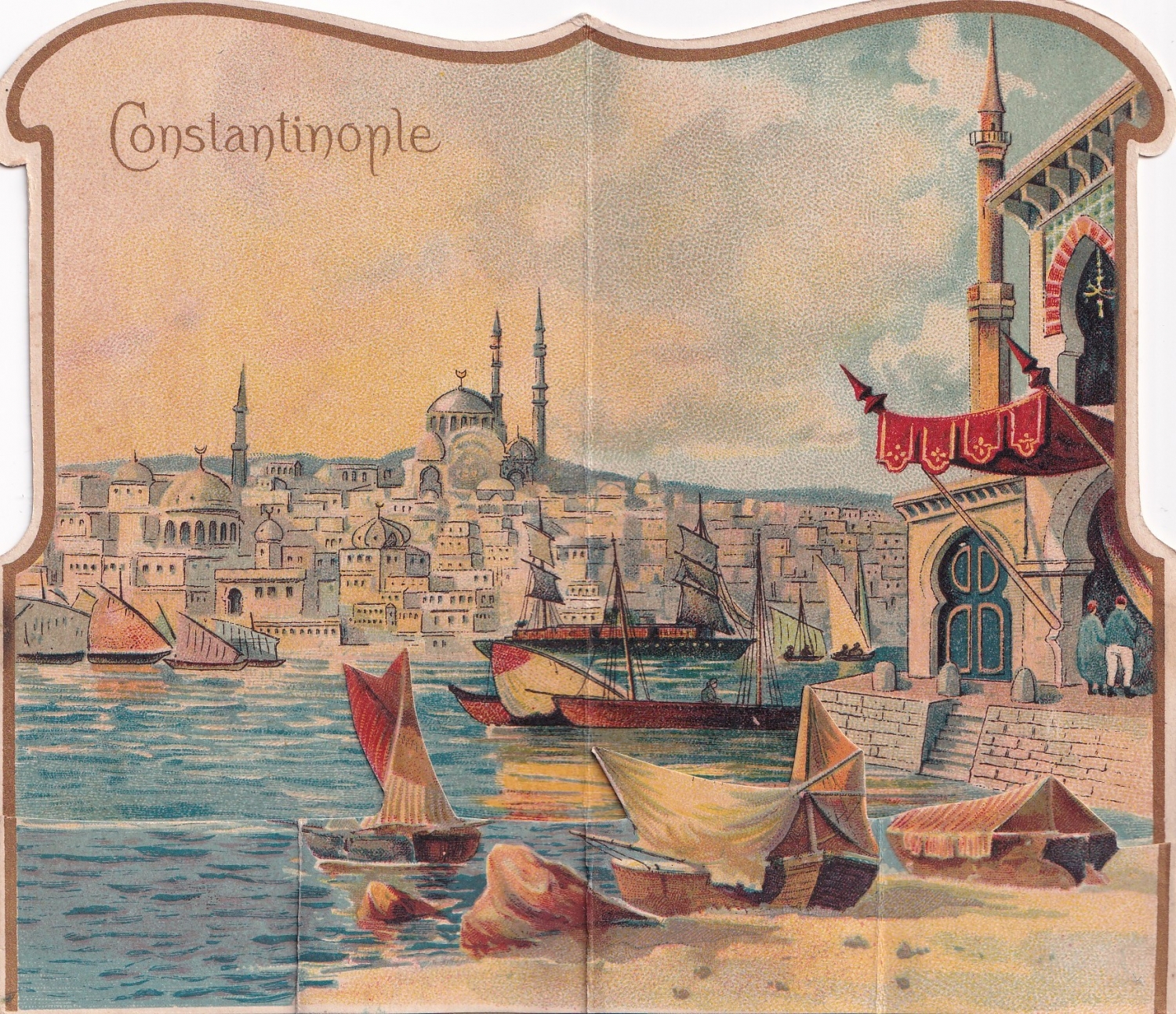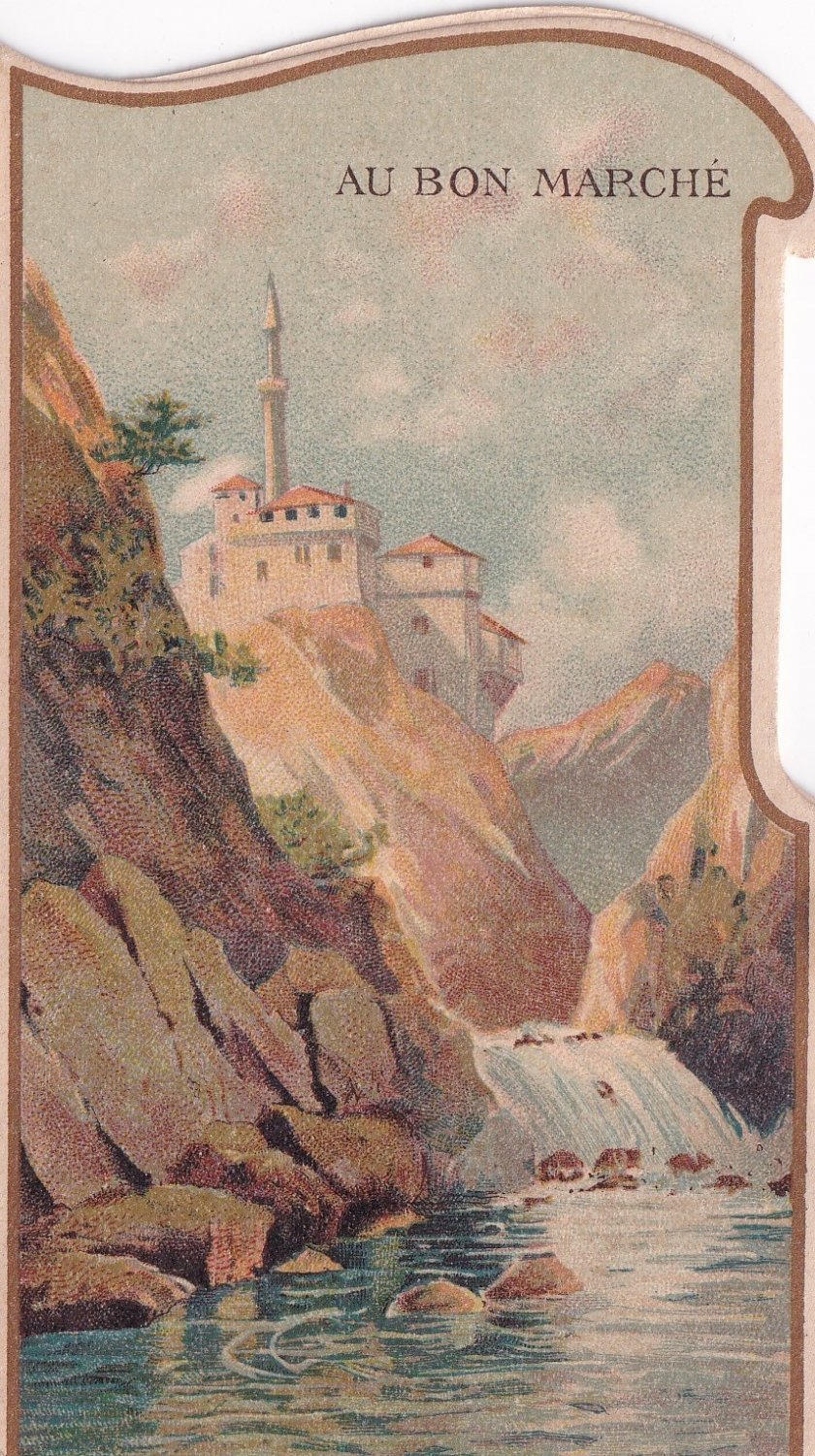 Constantinople taşbaskı 3 boyutlu kartpostal, Bon Marche reklamlı, 7x12 cm