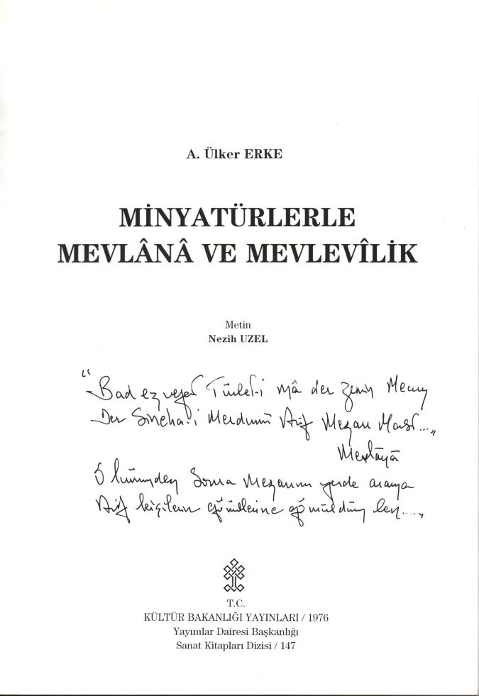 MİNYATÜRLERLE MEVLANA VE MEVLEVİLİK, A. Ülker Erke - Nezih Uzel, Nezih Uzel´den ithaflı ve imzalı, T.C. Kültür Bakanlığı Yayınları / 1976, 68 sayfa, 24x34 cm