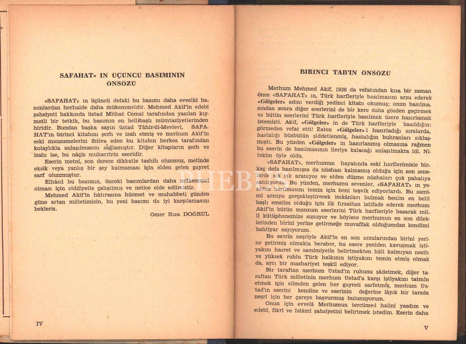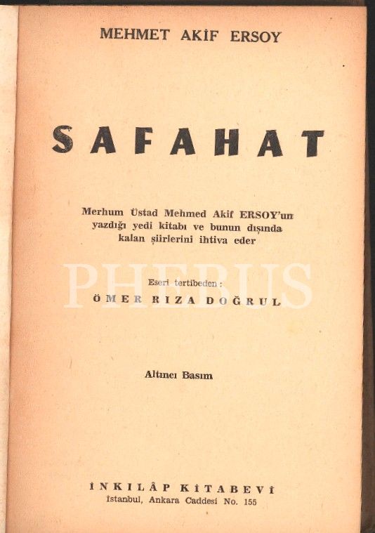 SAFAHAT (Merhum Üstad Mehmed Akif Ersoy´un yazdığı yedi kitabı ve bunun dışında kalan şiirlerini ihtiva eder), Hazırlayan: Ömer Rıza Doğrul, İnkılap Kitabevi, İstanbul - 1963, 560 sayfa, 14x20 cm