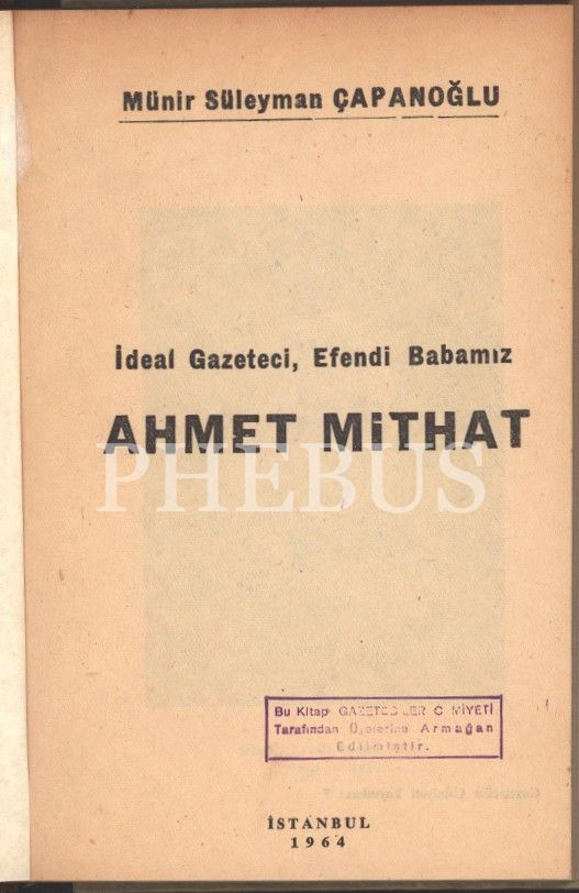 İDEAL GAZETECİ EFENDİ BABAMIZ AHMET MİTHAT, Münir Süleyman Çapanoğlu, Gazeteciler Cemiyeti Yayınları: 7, İstanbul 1964, 244 sayfa, 16x22 cm