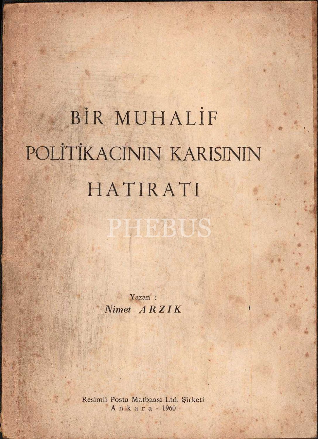 BİR MUHALİF POLİTİKACININ KARISININ HATIRATI, Nimet Arzık, Resimli Posta Matbaası Ltd. Şirketi, Ankara - 1960, 44 sayfa, 14x20 cm
