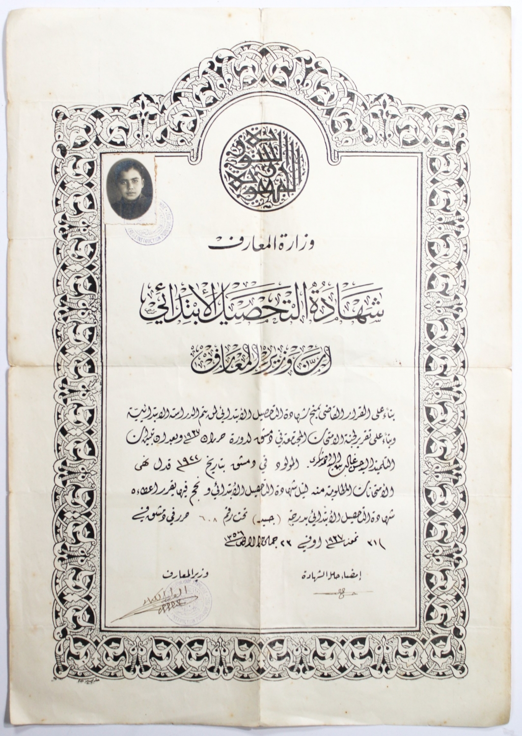 1927 tarihli Arapça ibtidai diploması, Suriye okul damgalı, 25x34 cm