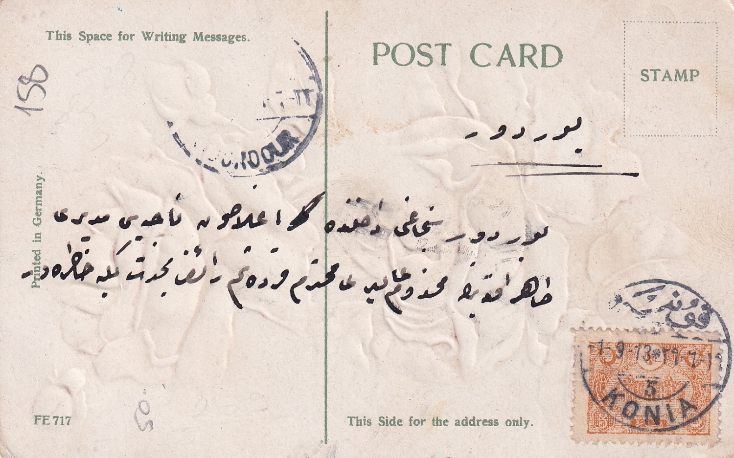 Osmanlı güller görsel bayram tebrik kartpostalı, Osmanlıca ithaflı imzalı, postadan geçmiş pullu Konya damgalı
