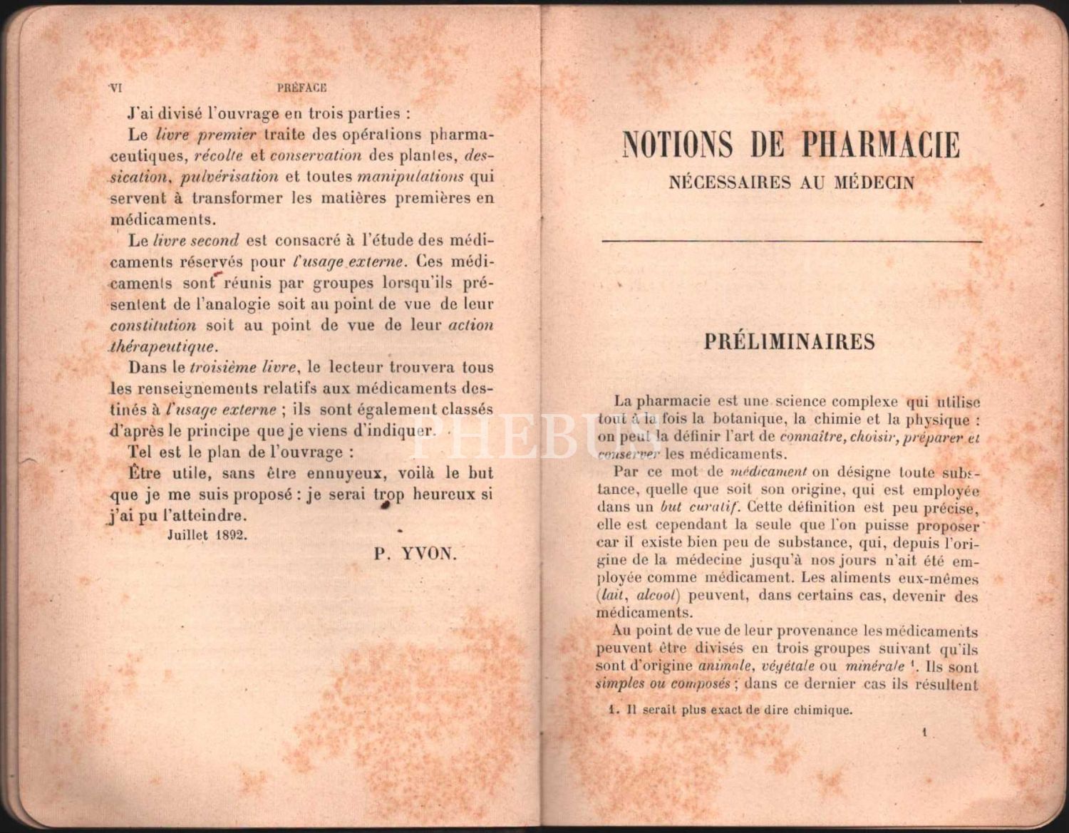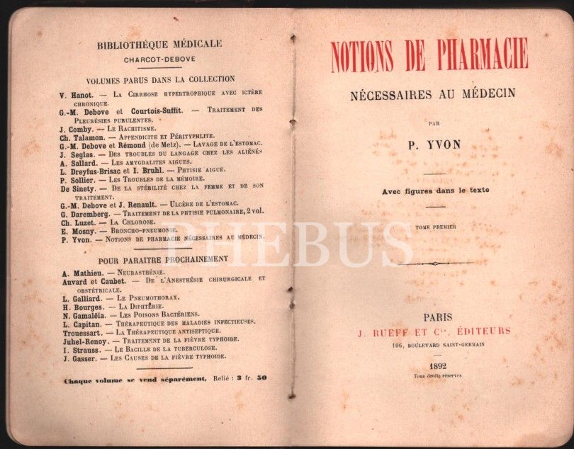 NOTIONS DE PHARMACIE - NECESSAIRES AU MEDECIN, P. Yvon, Paris - 1892, 183 sayfa, 12x18 cm, sırtı haliyle,