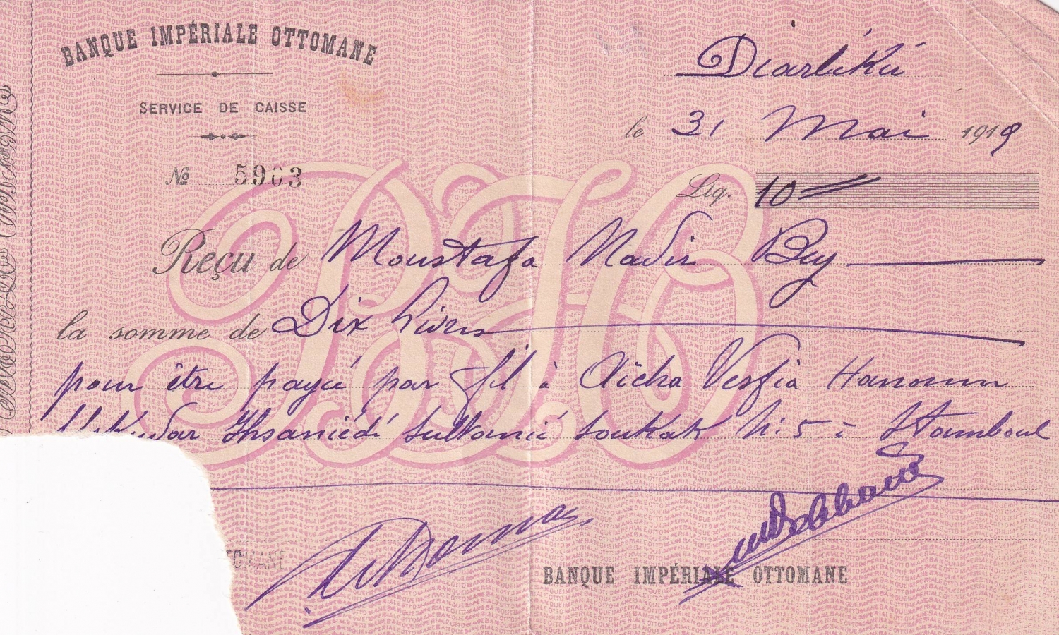 1919 Osmanlı Bankası çek, sol alt köşe kopuk, 20x10 cm