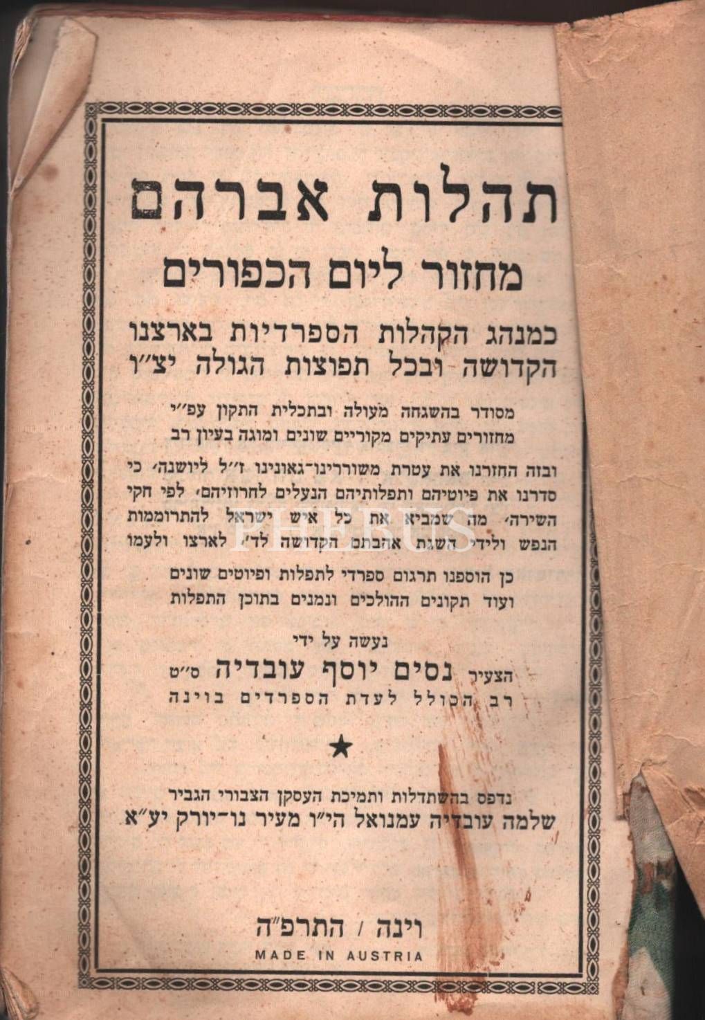 İbranice kitap, Viyana - 1905, 14x20 cm, metin kısmı ciltten ayrık haliyle