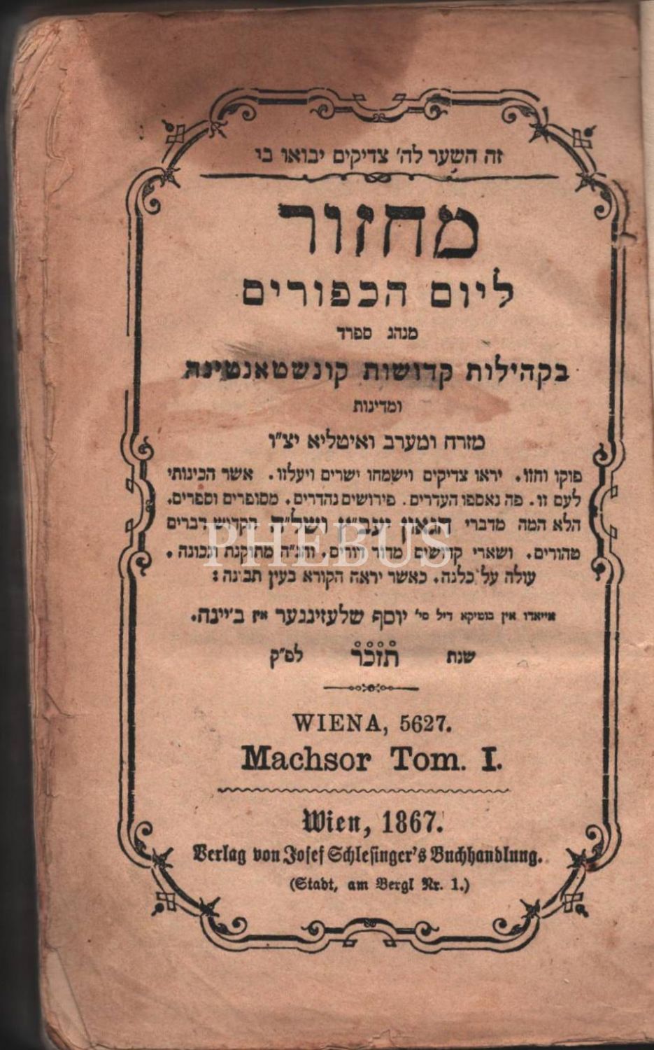 İbranice kitap, Viyana - 1867, 14x20 cm, ön kapağın üst köşesi haliyle