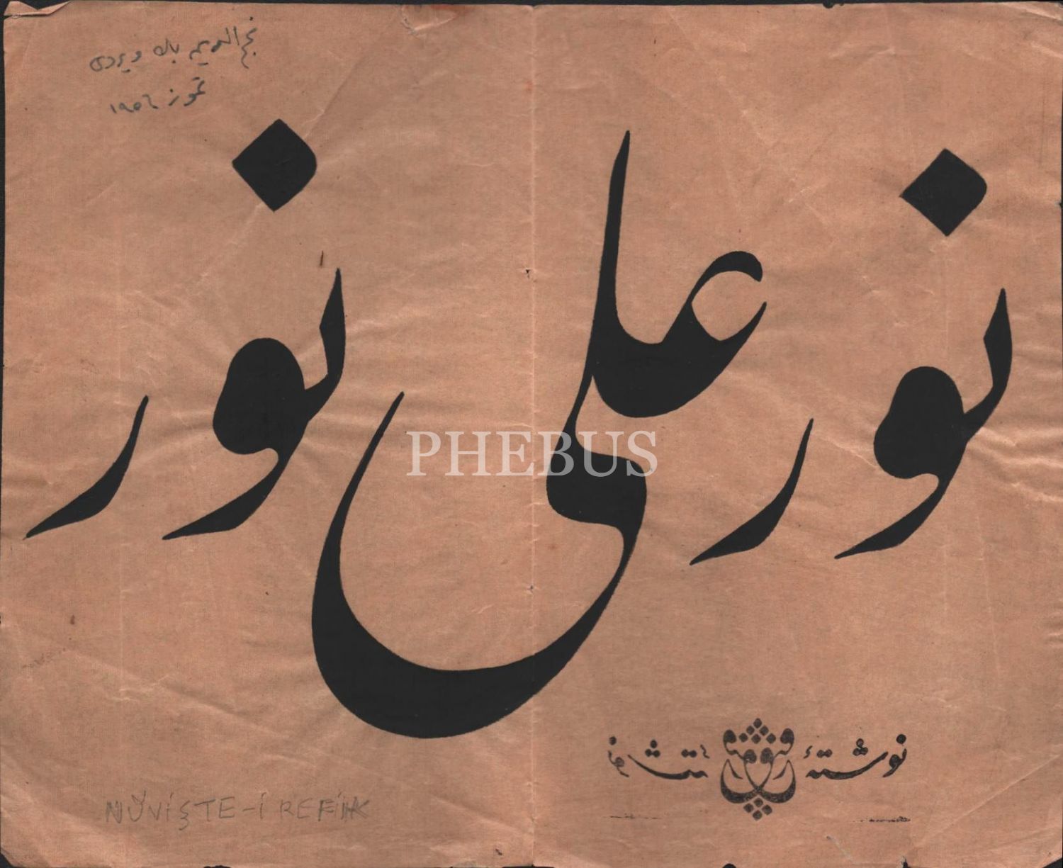 Hoca işi celî ta´lik hat ile "Nûrun alâ nûr", Nüvişte-i Refîk mühürlü ve arkasında ince ta´lik ile zarifçe yazılmış dua (4x8 cm), 17x21 cm,