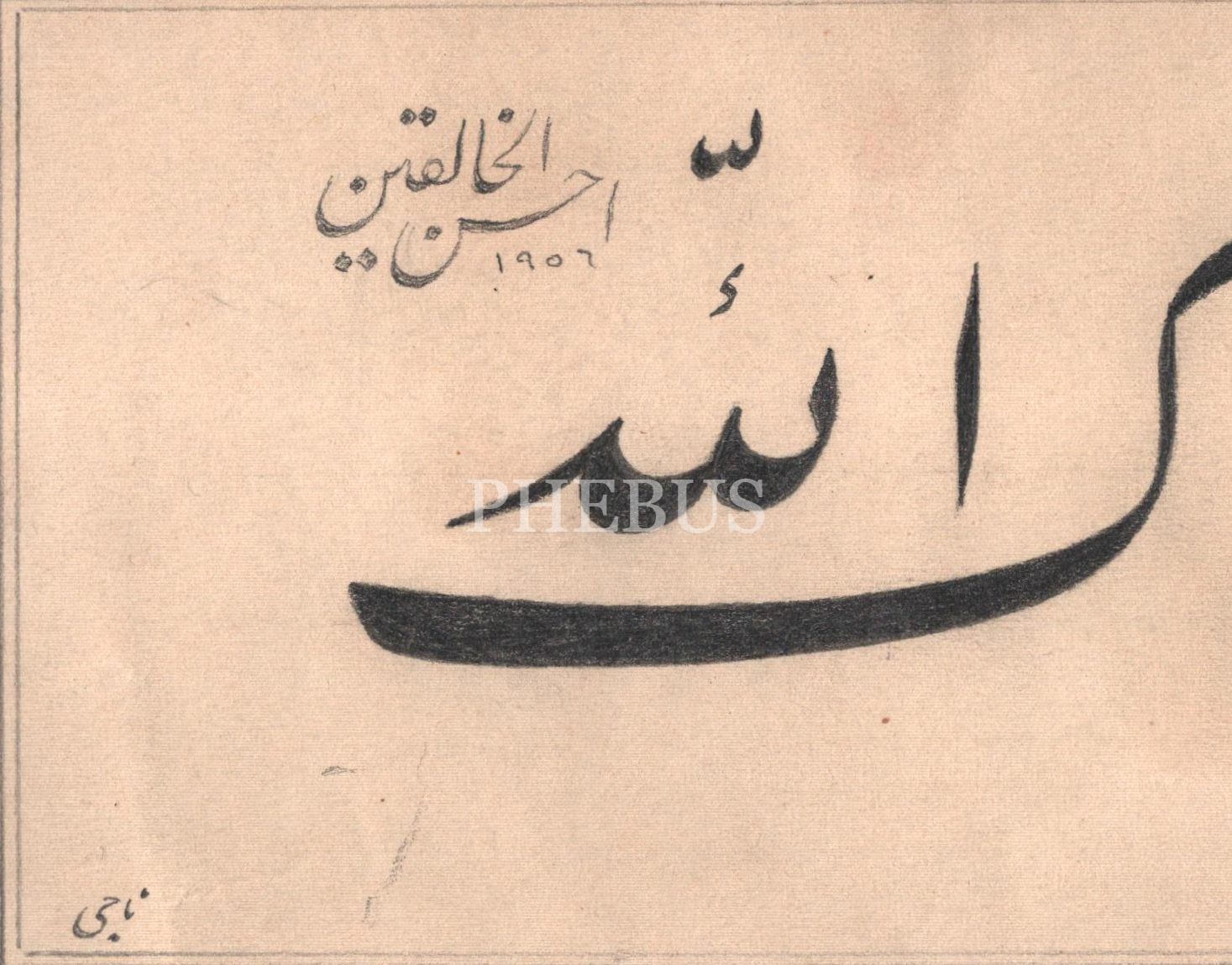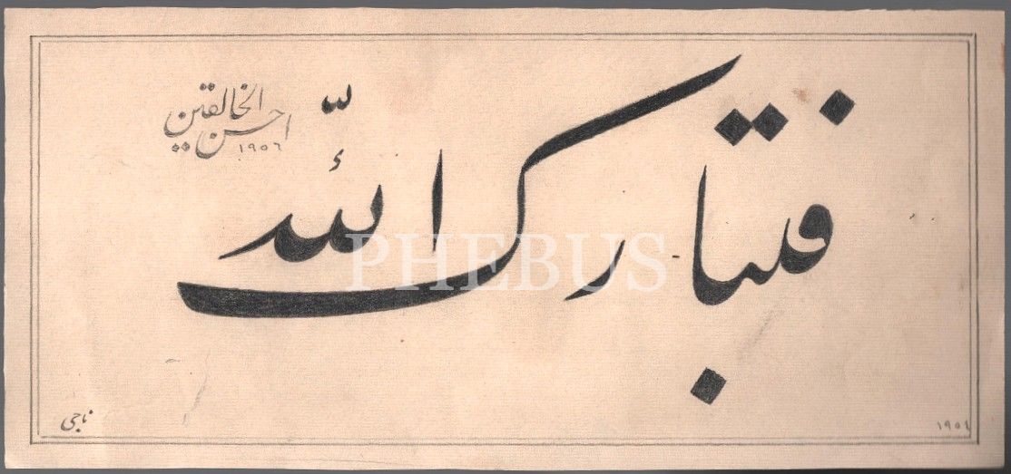 Nâci (Akverdi) ketebeli, 1956 tarihli kurşun kalem ile ta´lik-celî ta´lik "Fe-tebârekallâhu ahsenü´l-hâlikîn", 13x41 cm