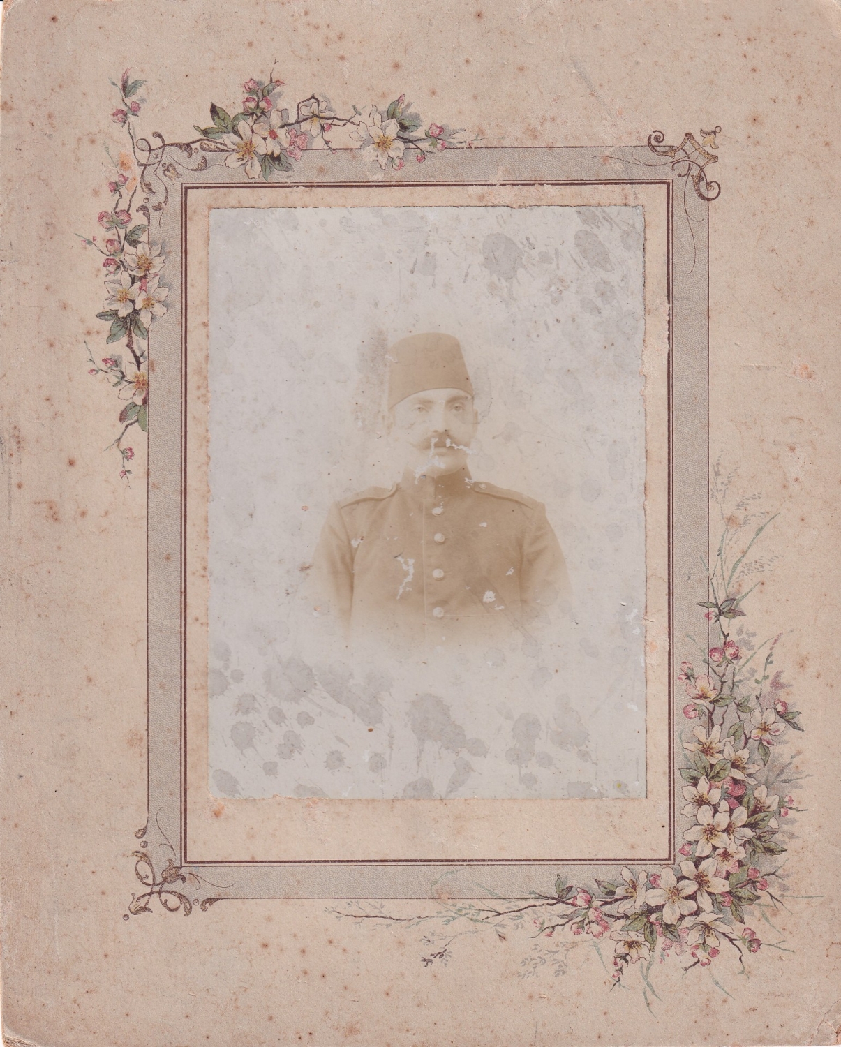 Fesli Osmanlı subayı kabin fotoğraf, arkası Osmanlıca ithaflı imzalı, 21x26 cm