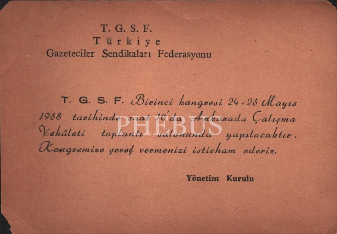 T. G. S. F. kongre davetiyesi, 1958, 10x14 cm