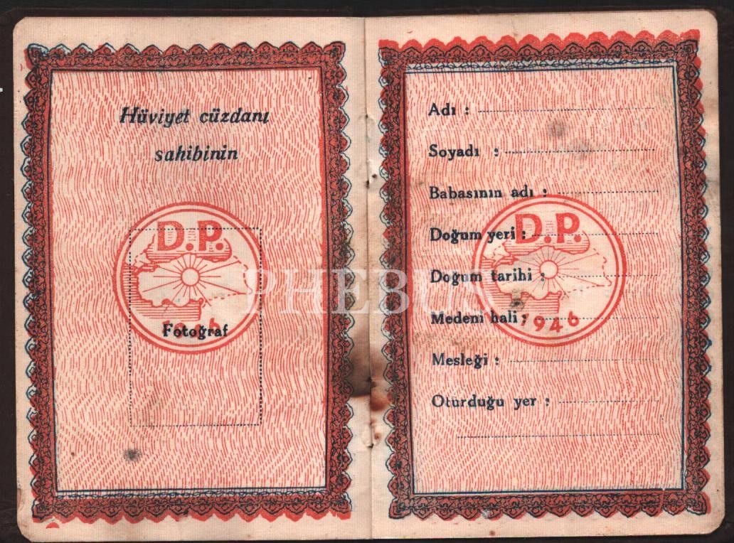 1946 tarihli D. P. boş kimlik kartı, 9x13 cm