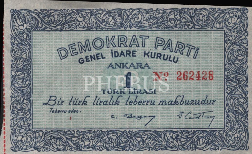 Demokrat Parti Türk lirası teberru makbuzu, 8x11 cm
