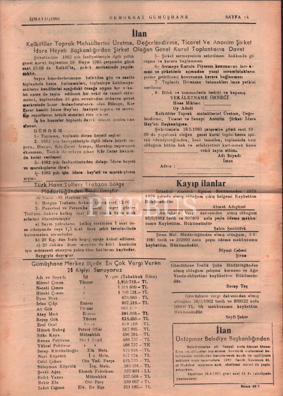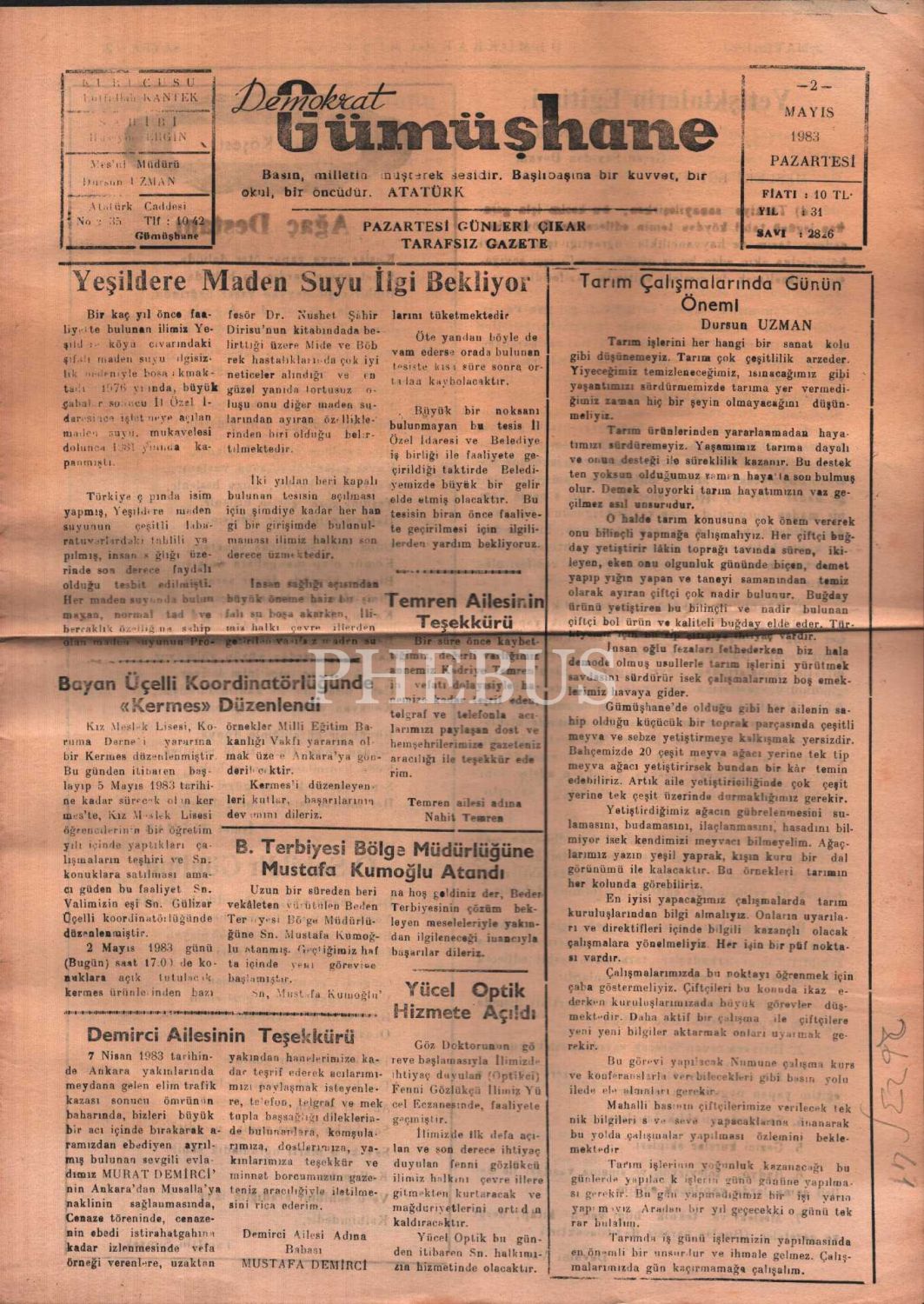1983 tarihli Demokrat Gümüşhane Gazetesi, 4 sayfa, 28x40 cm
